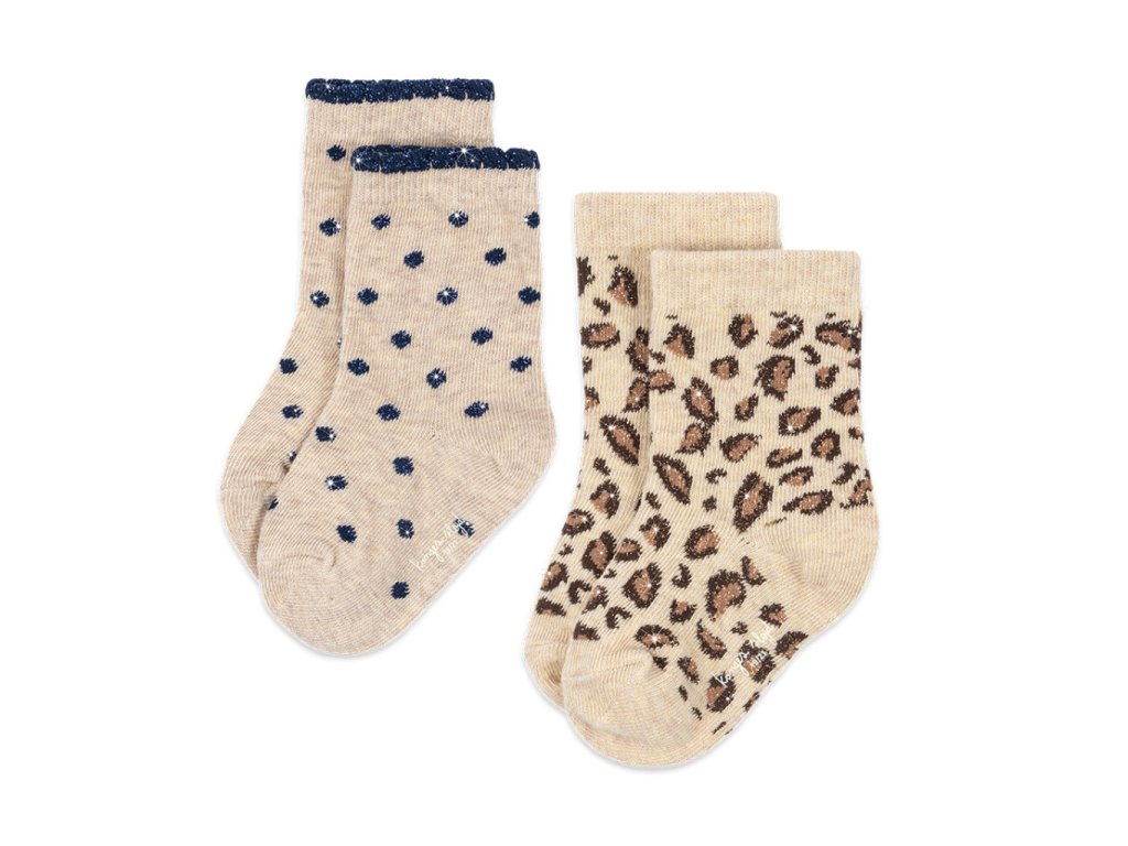 Žakárové dětské ponožky vyrobené z měkoučké organické bavlny od dánské značky Konges Sløjd. V balení jsou dva páry v krémové barvě zdobené třpytivými puntíky a leopardím vzorem.