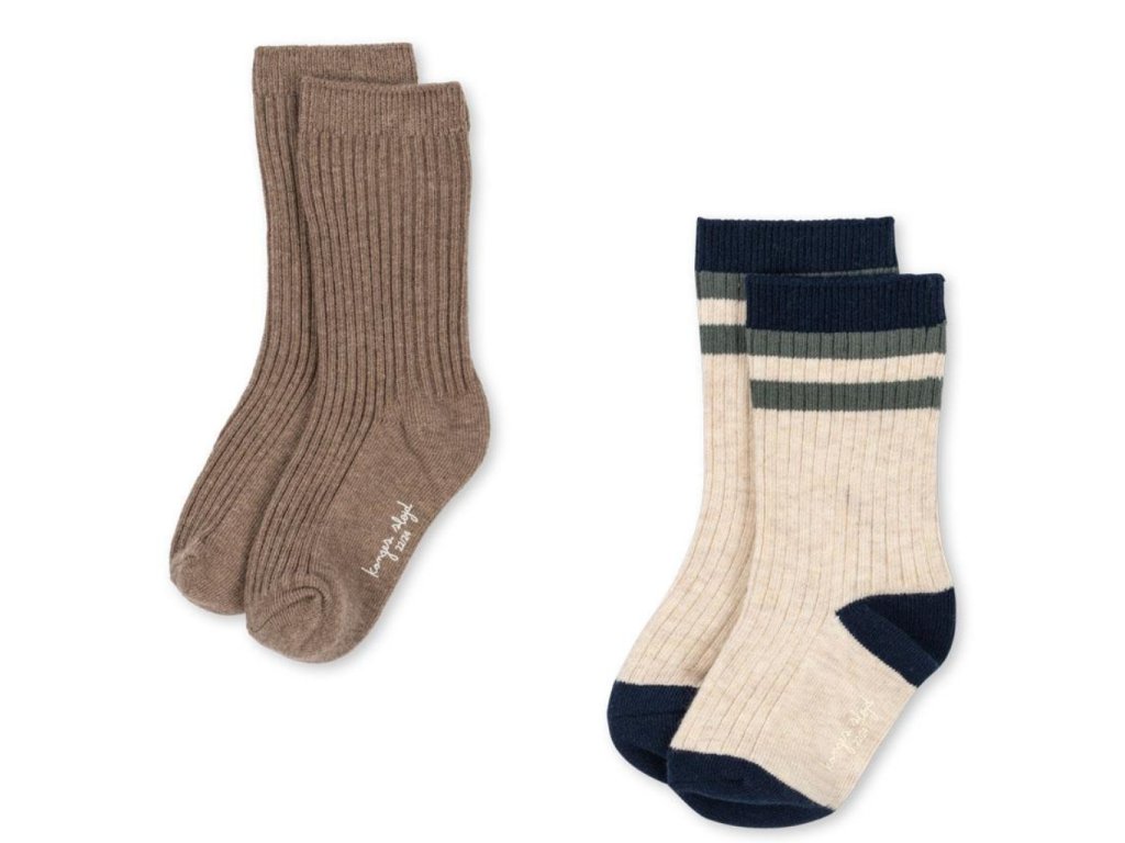 Žebrované dětské ponožky vyrobené z měkoučké organické bavlny od dánské značky Konges Sløjd. V balení jsou dva páry. Jeden je úplně jednoduchý hnědý, druhý je béžový s tmavými proužky, patou a špičkou.