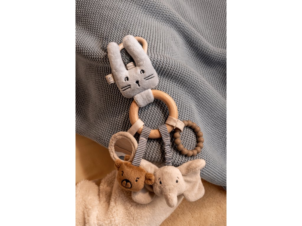Aktivity kroužek je vyrobený ze dřeva a měkkého silikonu – materiálu, který mohou děti bezpečně strkat do pusy. Na kroužek jsou pomocí pásků z recyklovaného polyesteru připevněné měkké hračky vyrobené taktéž z recyklovaného polyesteru s certifikací GRS. Jeden z pásků je elastický, určený k rozvoji hmatu. Na dalších páscích jsou zvířátka, která vydávají jemný chrastivý zvuk. Kroužek má také háček, za který ho lze pověsit do kočárku, nad postýlku nebo na hrazdičku.