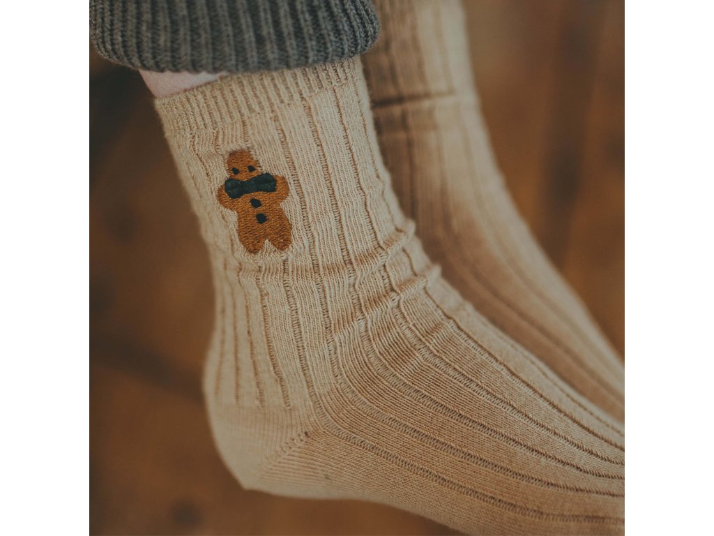Dětské ponožky v pískové barvě s roztomilou výšivkou Pana Perníčka od značky Donsje. Ponožky jsou ušité z kvalitní organické bavlny, která zaručuje pohodlí, prodyšnost a perfektní přizpůsobení. Ideální na procházky, domácí lenošení nebo jako stylový doplněk do každodenního outfitu.