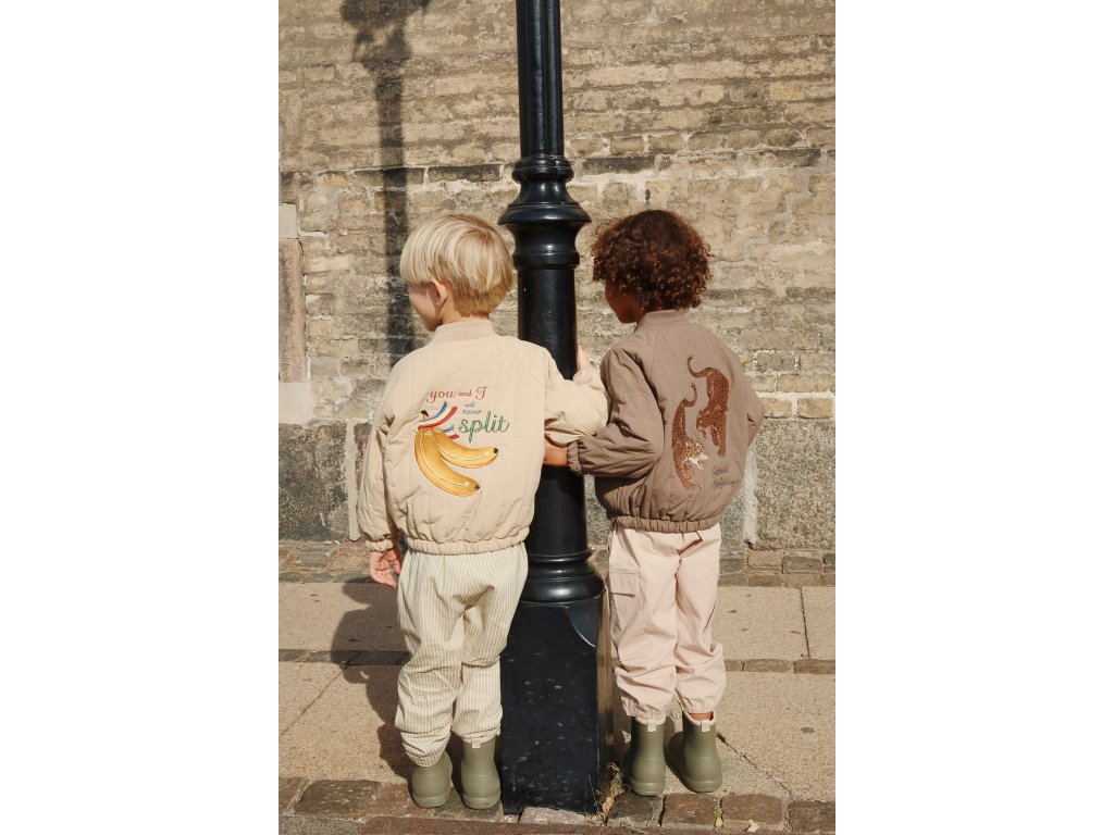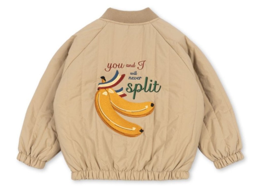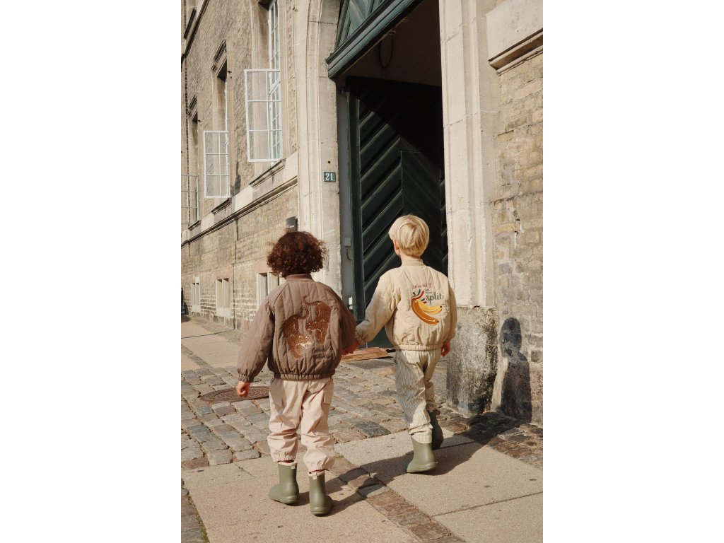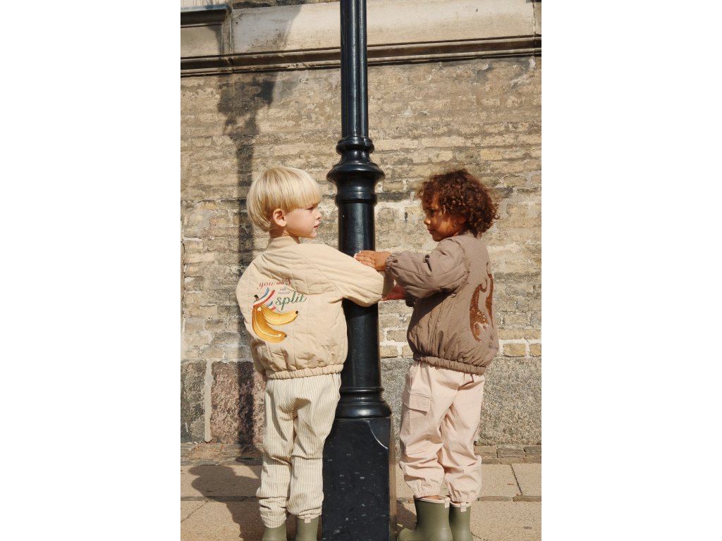 Bomber od dánské značky Konges Sløjd je již stálicí v našich podzimních a jarních kolekcích. Tento v béžové barvě s roztomilou výšivkou banánu milujeme! Bomber je lehký, snadno ho sbalíte s sebou na cesty, je větruvzdorný a díky povrchové úpravě Bionic Finish® Eco také vodoodpudivý. Využijete ho na podzim, během jara i chladnějšího léta. Hodí se na pobíhání po městě, bez starostí s ním můžete vyrazit na hřiště nebo na výlet třeba do vaší oblíbené zoo.
