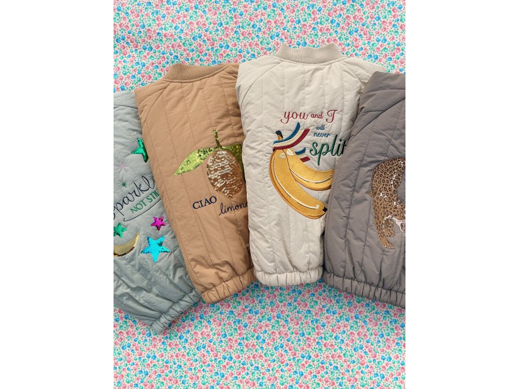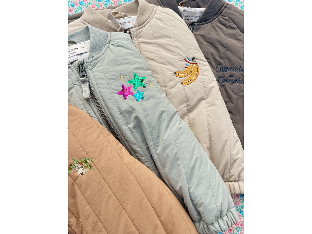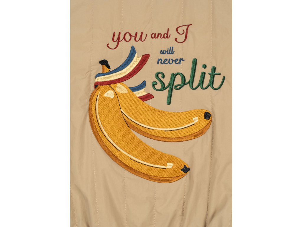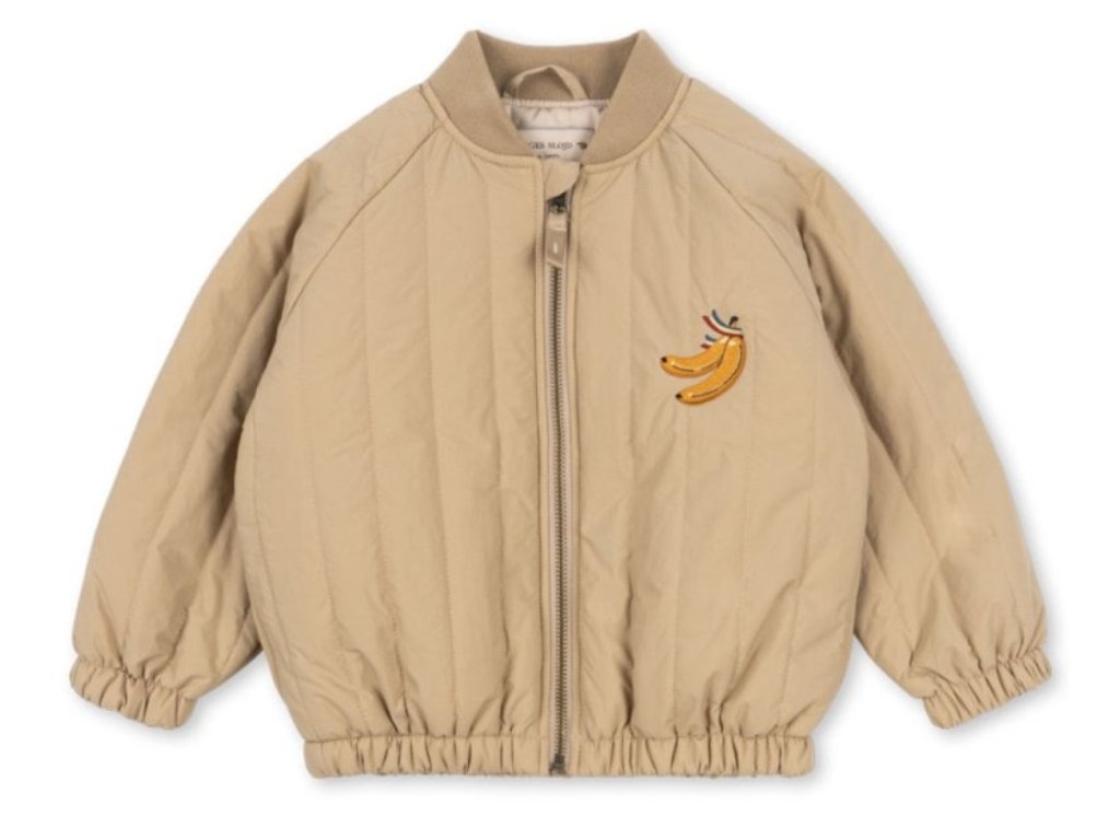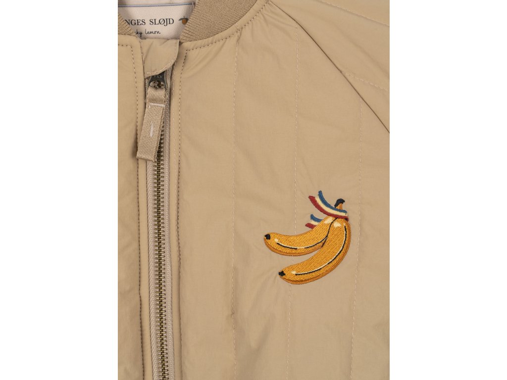 Bomber od dánské značky Konges Sløjd je již stálicí v našich podzimních a jarních kolekcích. Tento v béžové barvě s roztomilou výšivkou banánu milujeme! Bomber je lehký, snadno ho sbalíte s sebou na cesty, je větruvzdorný a díky povrchové úpravě Bionic Finish® Eco také vodoodpudivý. Využijete ho na podzim, během jara i chladnějšího léta. Hodí se na pobíhání po městě, bez starostí s ním můžete vyrazit na hřiště nebo na výlet třeba do vaší oblíbené zoo.