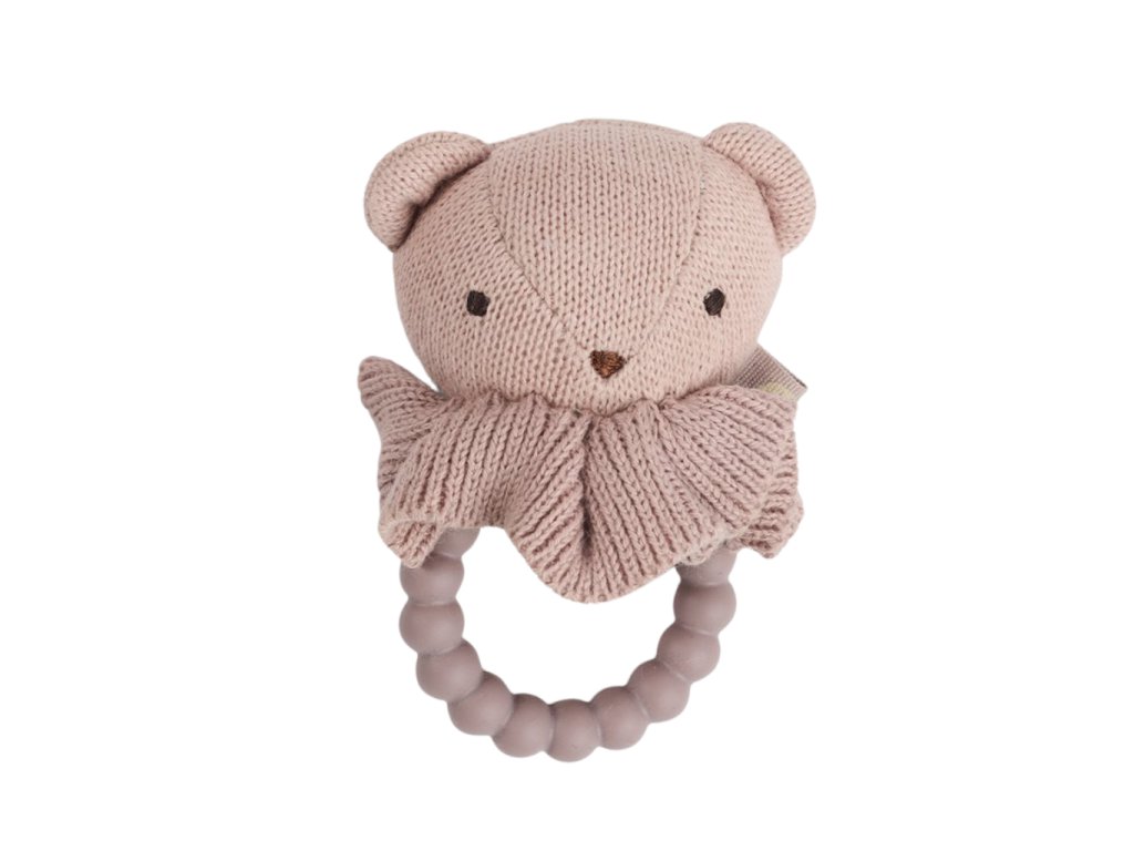 Roztomilé háčkované chrastítko ve tvaru medvídka se silikonovým kroužkem. Děti si s ním mohou bezpečně hrát a prozkoumávat různé textury na jeho povrchu. Silikonový kroužek jemně masíruje a zklidňuje dásně při prořezávání prvních zoubků.