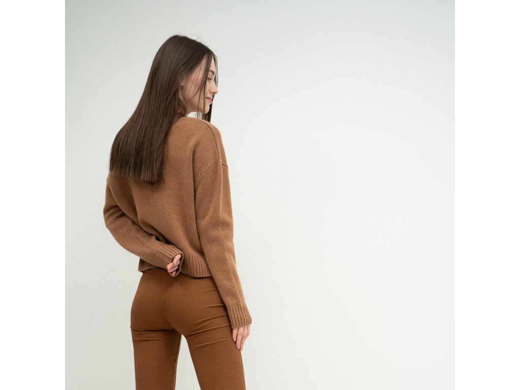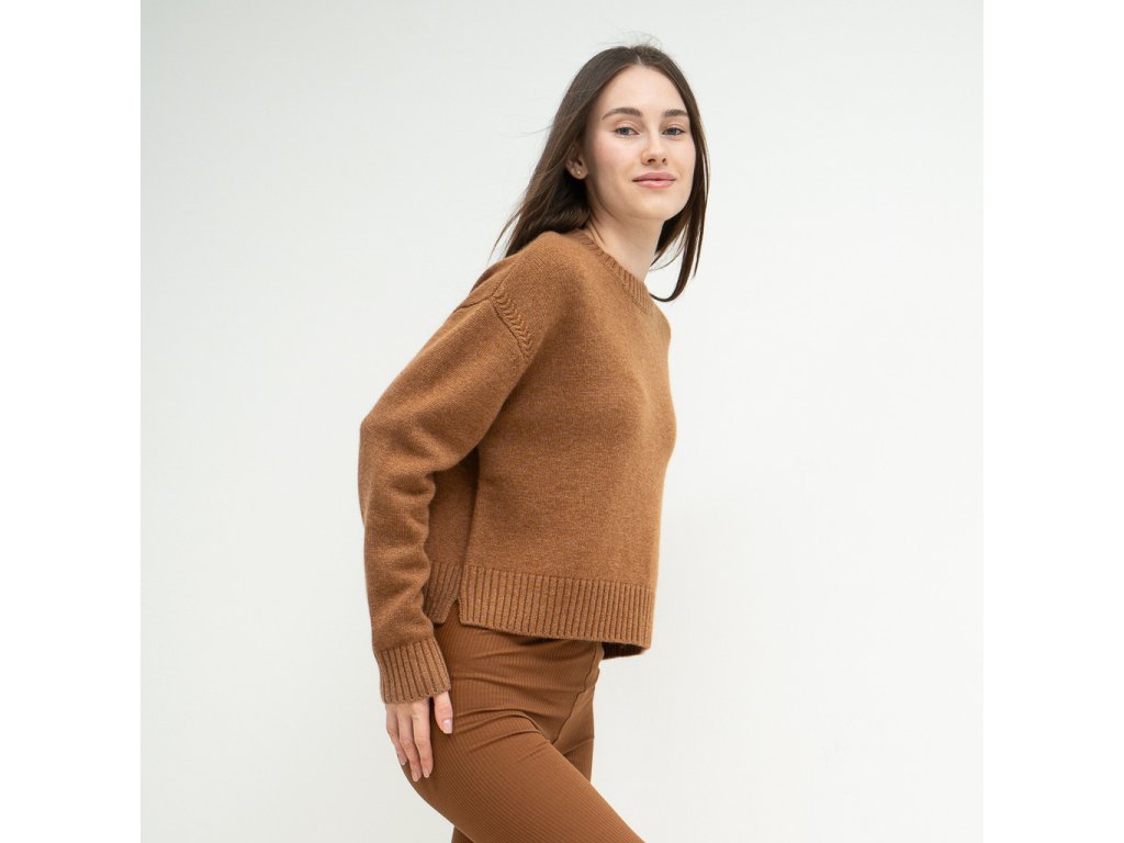 Jednoduchý karamelový dámský svetr je vyrobený z přírodních prodyšných a hřejivých materiálů, které během chladného období poskytují tu nejdokonalejší tepelnou izolaci. Jehněčí vlna je božsky měkoučká, nekouše ani nedráždí pokožku. Přirozeně dýchá a má antibakteriální vlastnosti. Kašmír ji krásně doplňuje.