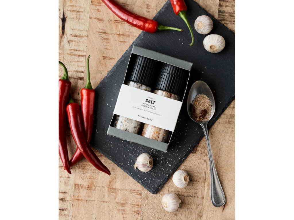 Značka Nicolas Vahé je známá svým pečlivým výběrem vysoce kvalitních surovin, dokonalou souhrou chutí i designovým balením. A to rozhodně platí i o těchto dvou jedinečných směsích soli s chilli a medvědím česnekem a bylinkové soli v dárkové kazetě.