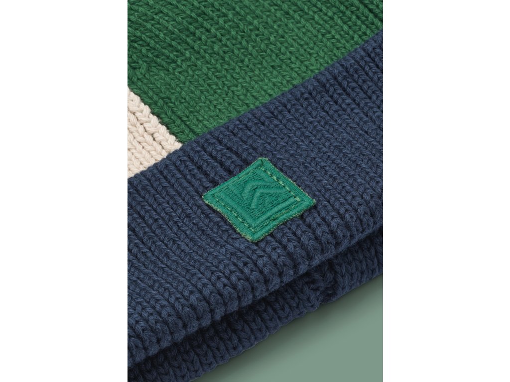 Čepice se širokým žebrovaným lemem vašim dětem dokonale padne. Je měkká, příjemně se nosí a skvěle chrání ouška před větrem. Designově je velmi nápaditá. Kombinuje tři barvy – krémovou, zelenou a tmavě modrou. V přední části je vyšité logo značky Liewood.
