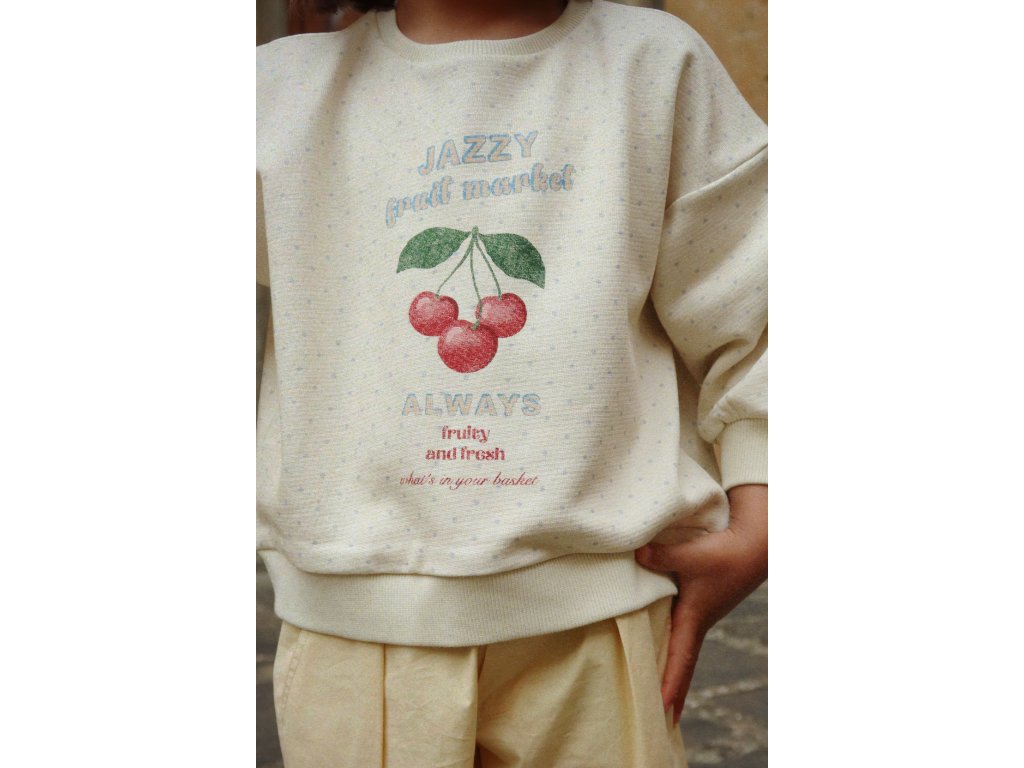 Měkoučká a pohodlná mikina s puntíky a potiskem třešničky. Má širší střih a spadlá ramena pro co nejvíc cool vzhled. Je příjemně teplá a přitom ne moc silná, takže je super na nošení během chladných i teplejších měsíců. Vynosíte ji do školky, na hřiště, nebo na jakýkoliv výlet, který spolu podniknete. Perfektní je také na domácí pohodu hezky u pohádek.