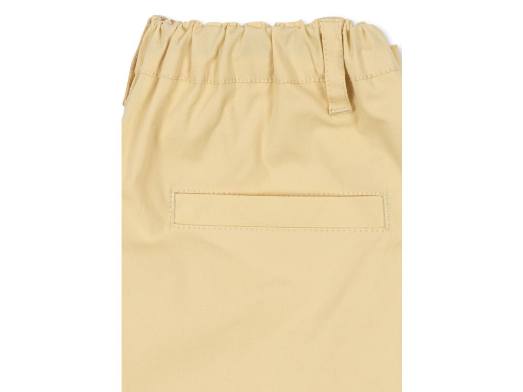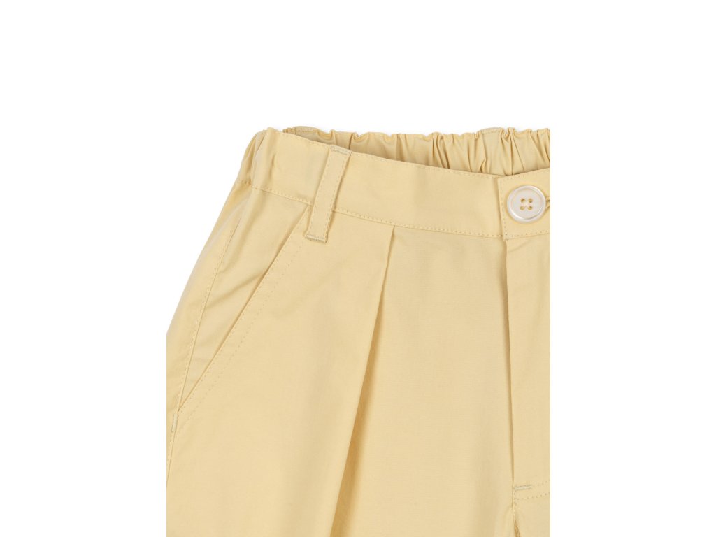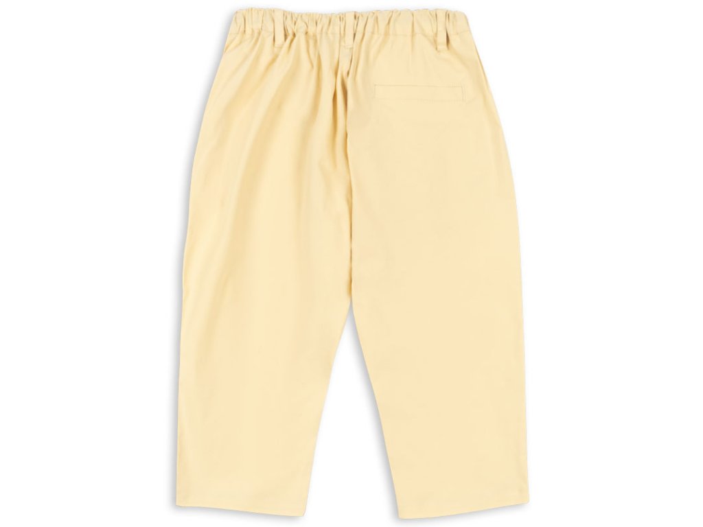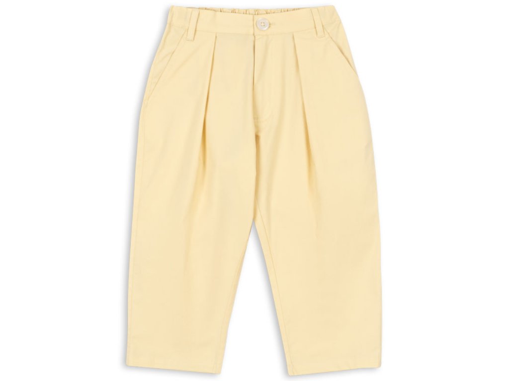 Dětské kalhoty ve žluté barvě s elastickým pasem pro holky i kluky od Konges Sløjd. Kalhoty mají volnější střih, falešný poklopec a zapínají se pomocí jednoho knoflíku. V pase nechybí nastavitelná elastická guma a praktická poutka, kterými lze prostrčit pásek.