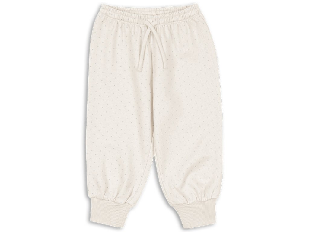 Klasické pohodlné tepláky pro děti v krémové barvě s šedými puntíčky. Měkké tepláky z organické bavlny se šňůrkou v pase.