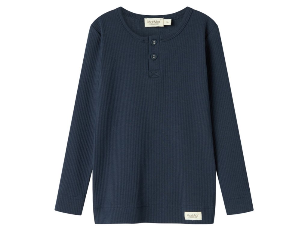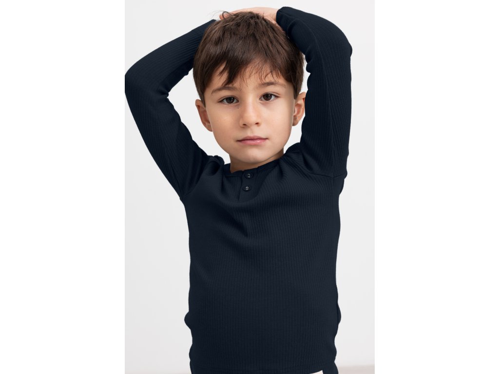 Pohodlné dětské triko s dlouhým rukávem a knoflíčky u krku z měkoučké organické bavlny a Tencel modalu. Má tmavě modrou barvu, je jednoduché a skvěle se kombinuje.
