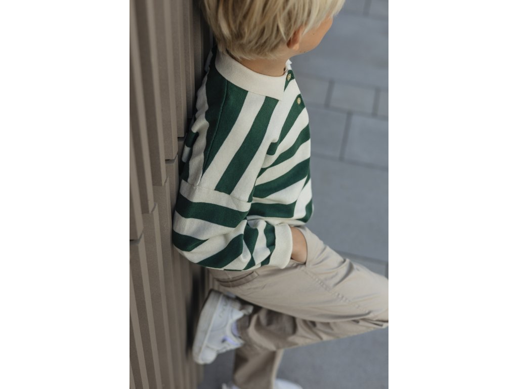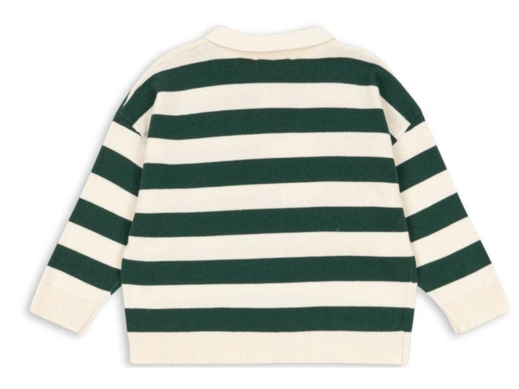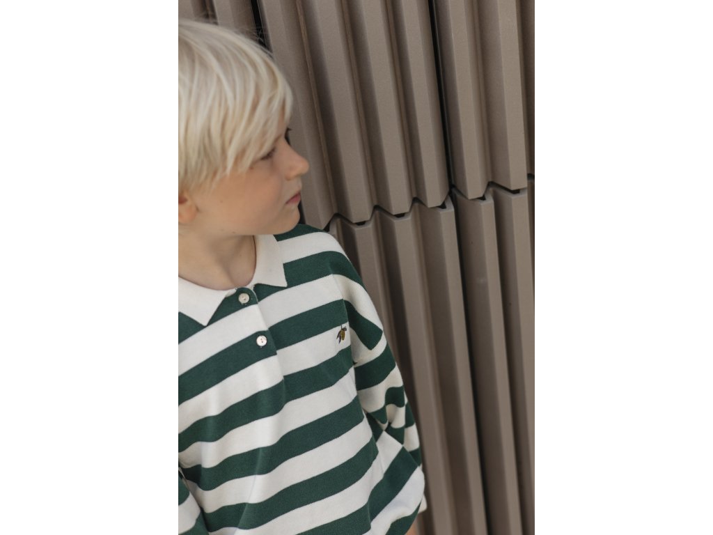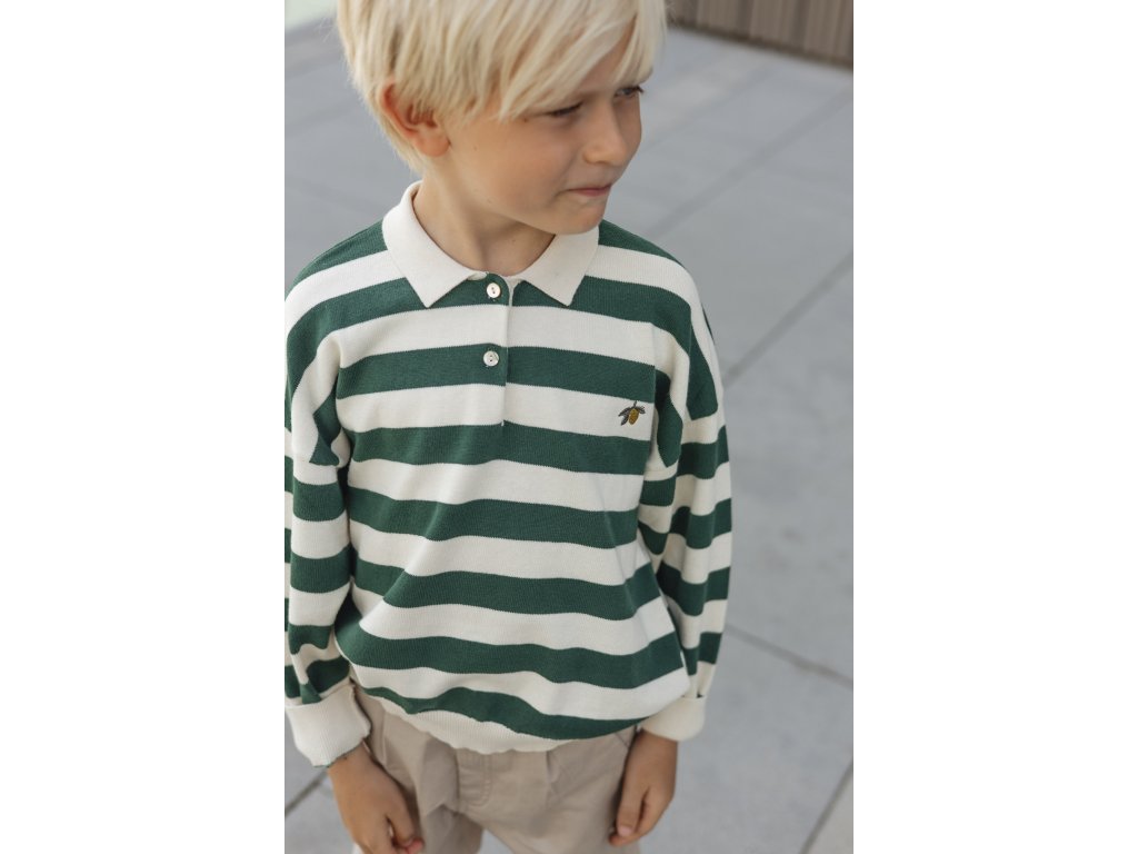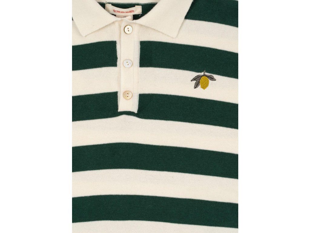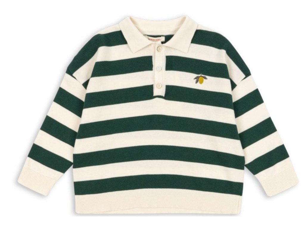 Dětské polo triko s roztomilou výšivkou citronu od značky Konges Sløjd. Triko má dlouhý rukáv, krémovou barvu a tmavě zelené proužky. Je ušité z certifikované organické bavlny, která je tak měkoučká a pohodlná, že si ho budete přát sami obléct.