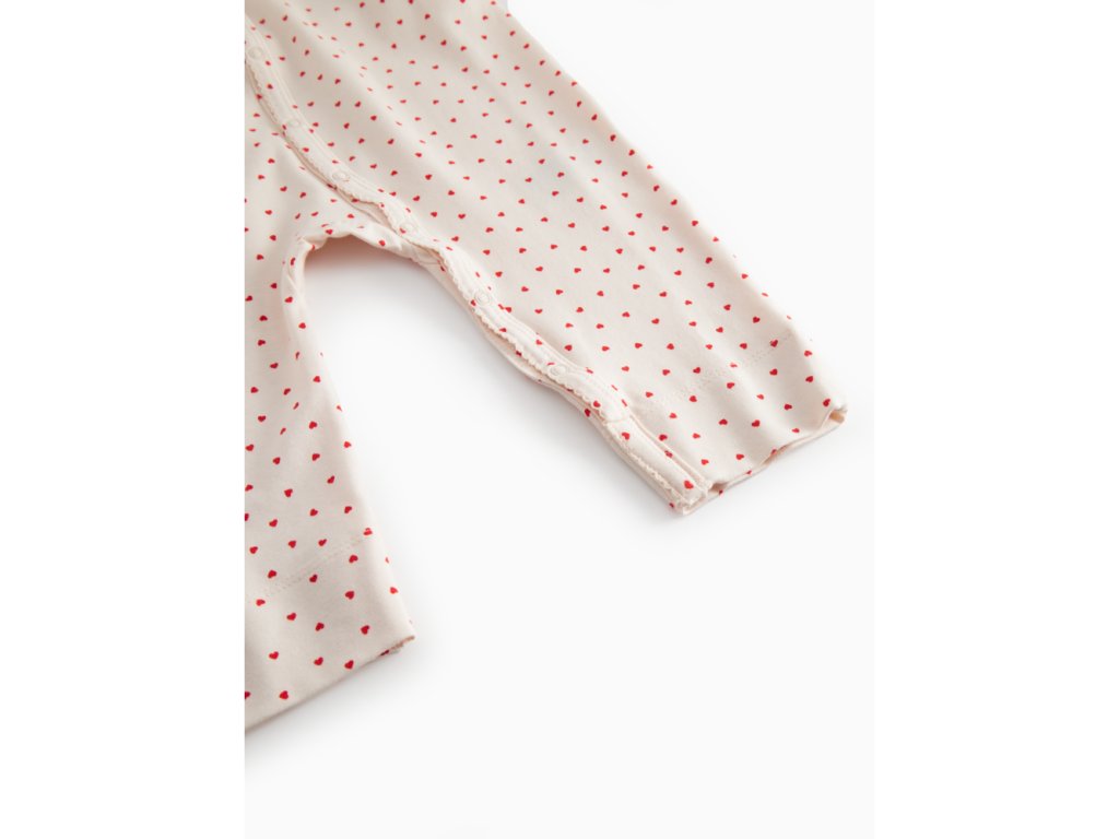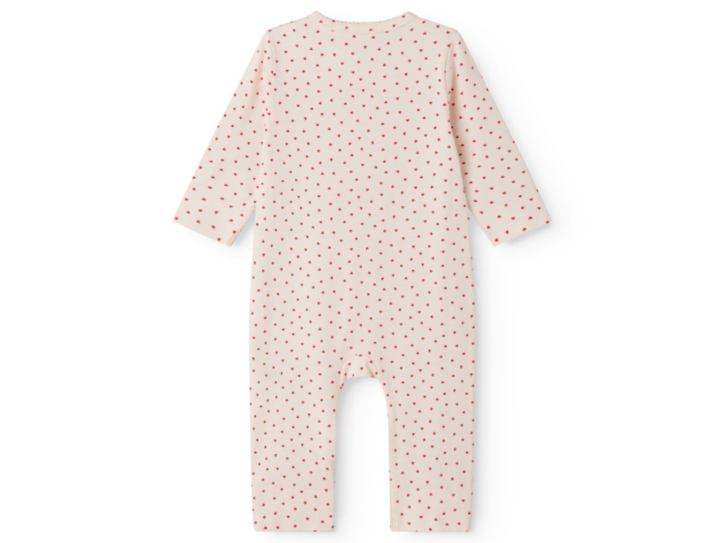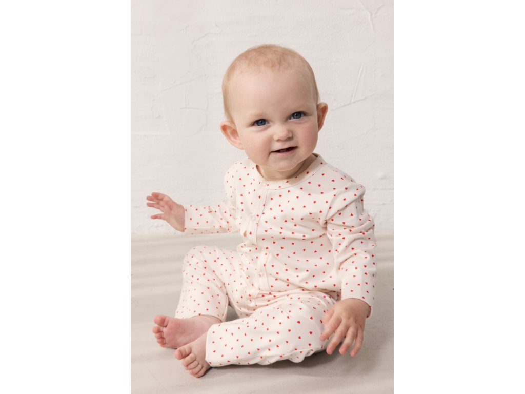 Pohodlný elastický overal s dlouhým rukávem s roztomilým vzorem srdíček z měkoučké organické bavlny a Tencel modalu. Overal má patentky po celé délce pro snadné oblékání a přebalování.