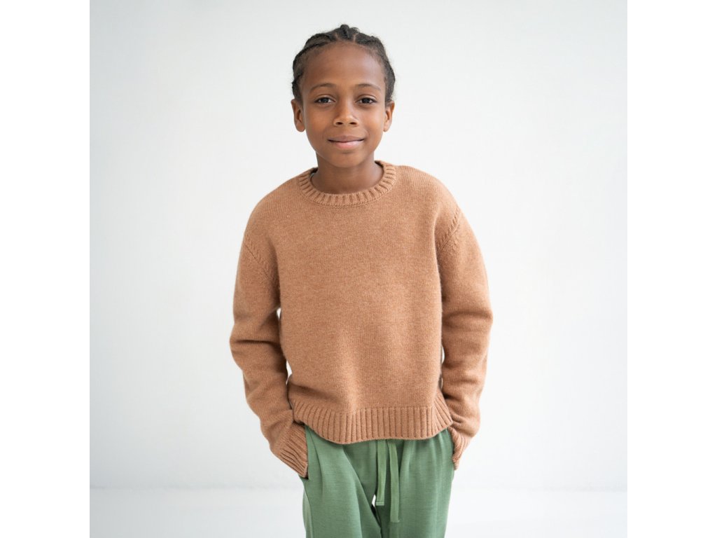 Jednoduchý karamelový svetr pro děti je vyrobený z přírodních prodyšných a hřejivých materiálů, které během chladného období poskytují tu nejdokonalejší tepelnou izolaci. Jehněčí vlna je božsky měkoučká, nekouše ani nedráždí pokožku. Přirozeně dýchá a má antibakteriální vlastnosti. Kašmír ji krásně doplňuje.