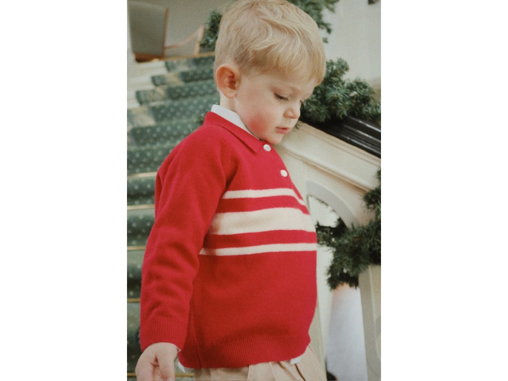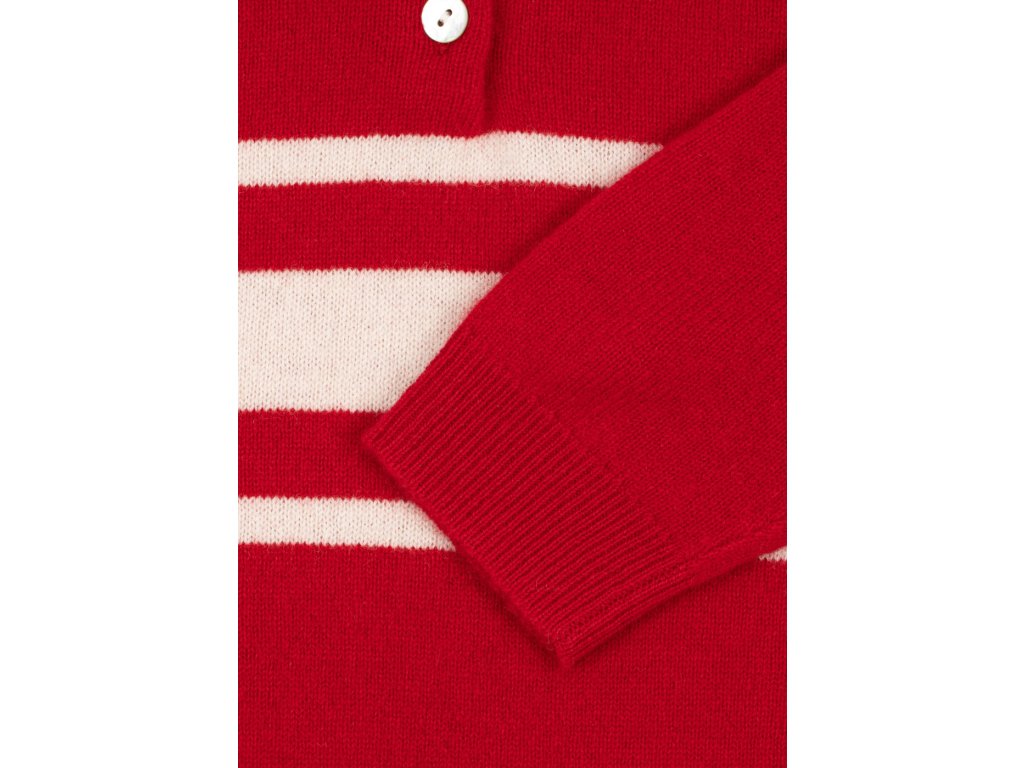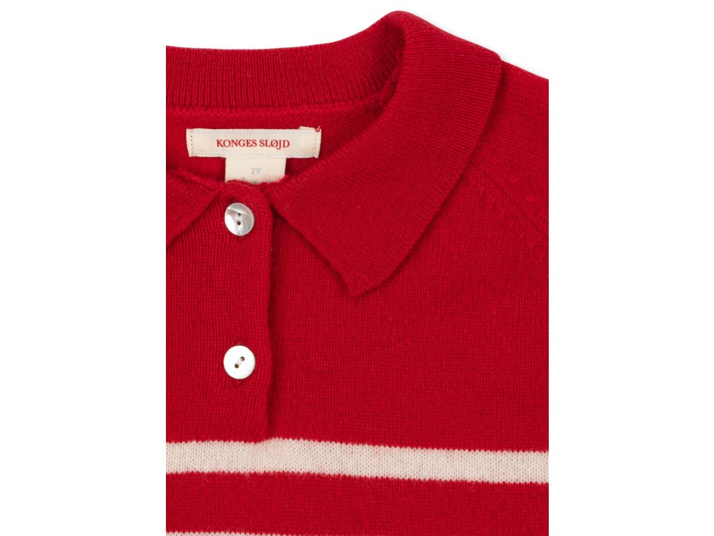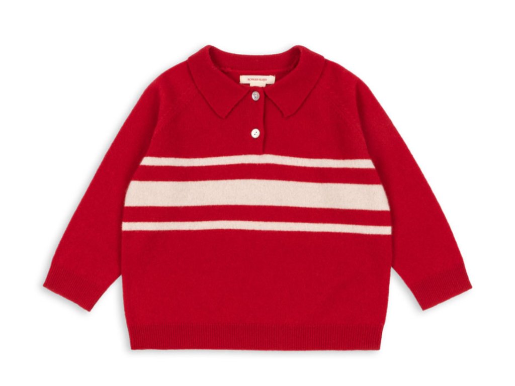 Měkoučký vlněný svetřík s límečkem v dokonalé červené barvě s decentními bílými proužky. Kouzelný kousek z vánoční kolekce naší milované značky Konges Sløjd.