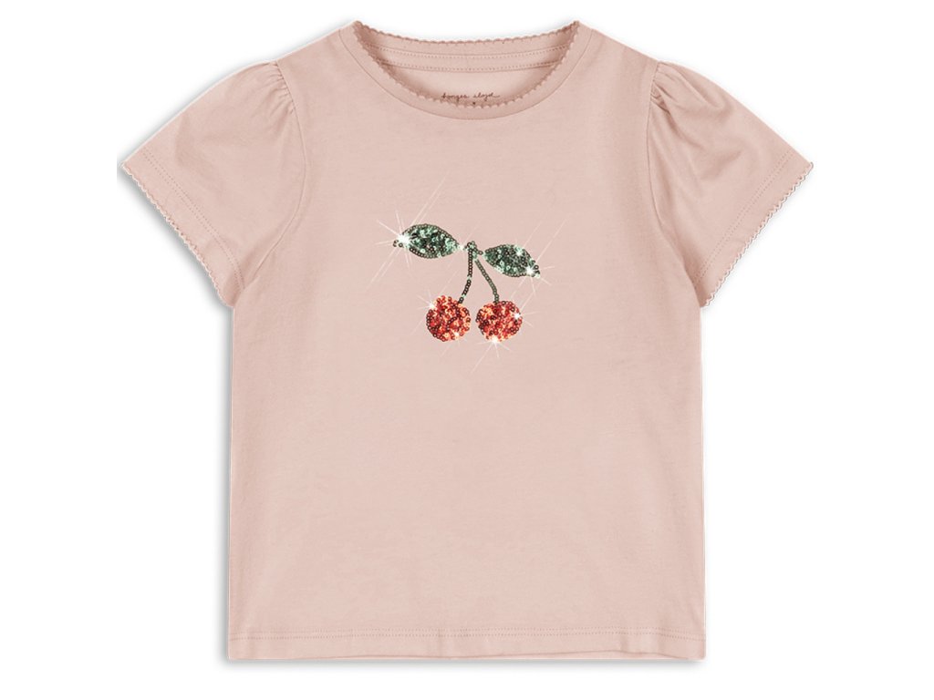 V tomto tričku s krátkými volánkovými rukávy od Konges Sløjd bude vaše malá parádnice za hvězdu. Tričko v jemném růžovém odstínu má na sobě několik nepřehlédnutelných detailů – elegantnín pikotový steh a roztomilou výšivku třešniček s flitry. Milujeme.