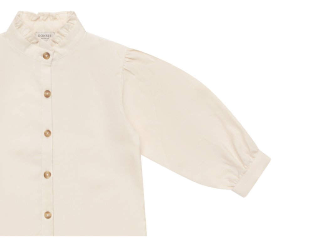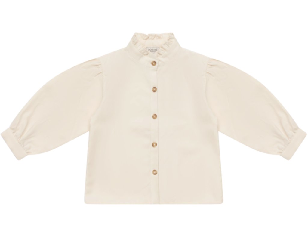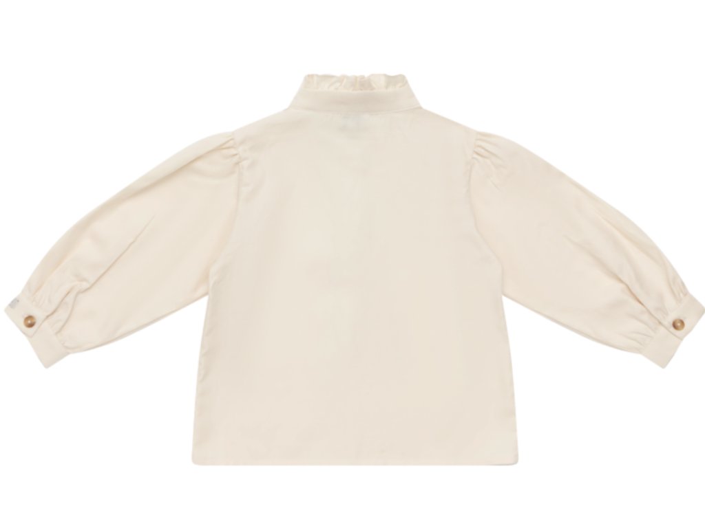Košile má volnější střih, který zaručuje maximální pohodlí a snadné vrstvení. Má balónové rukávy a stojáček s řasením. Zapíná se pomocí knoflíčků uprostřed.