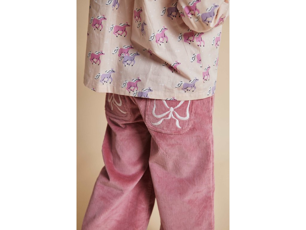 Dívčí manšestrové kalhoty s širokými nohavicemi od značky Copenhagen Colors. Kalhoty mají nádhernou růžovou barvu a jejich zadní kapsy zdobí kouzelná bílá výšivka mašliček. Pas tvoří měkká elastická guma, která je hezky drží na svém místě. Hurá za dobrodružstvím.