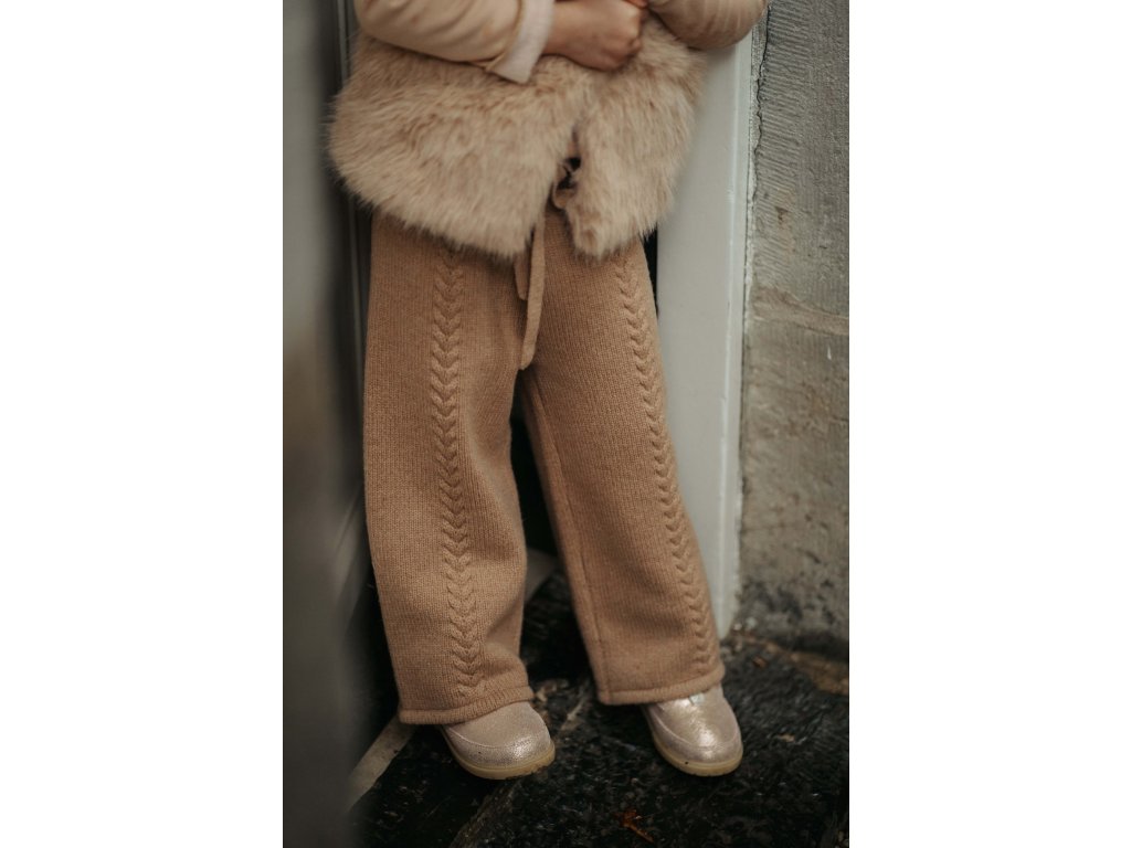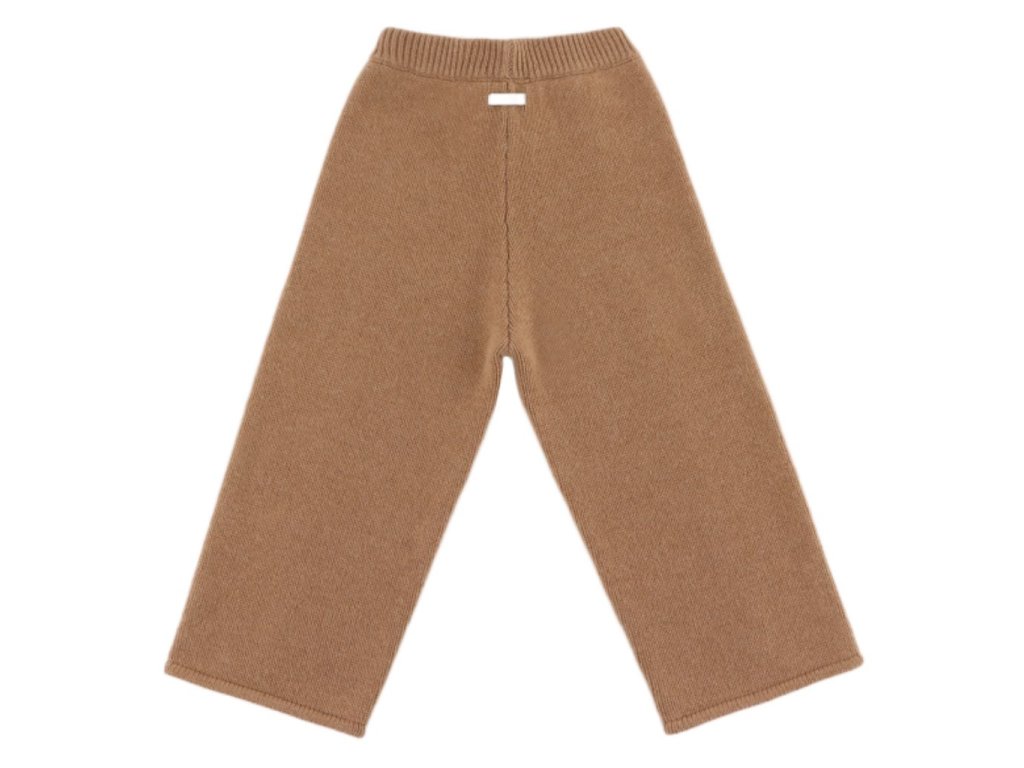 Pletené kalhoty zaujmou svým oříškově hnědým odstínem, který je snadno kombinovatelný a hodí se pro jakoukoli příležitost. Díky volnějšímu střihu a širokým nohavicím poskytují maximální pohodlí při pohybu a každodenním nošení. V pase mají pružnou gumu, která se přizpůsobí dětské postavě, a šňůrku pro ještě lepší upevnění.