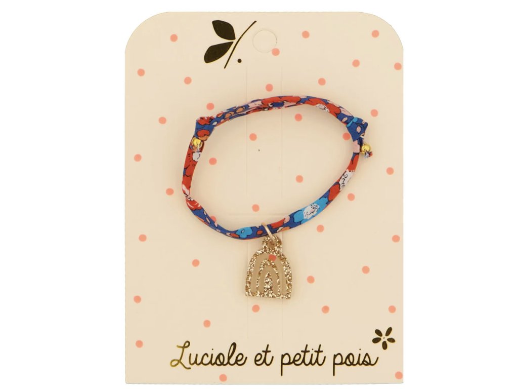 Stylový, jemný a neodolatelně roztomilý – tento náramek udělá radost každé malé princezně i větší slečně! Krásná šňůrka s ikonickým květinovým vzorem z látky Liberty of London je ozdobena zlatou duhou a je možné ji přizpůsobit šířce zápěstí.