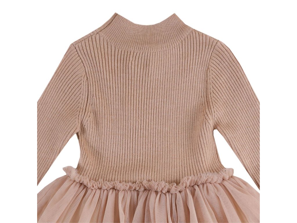 Holčičí šaty značky Donsje mají úpletový top s dlouhým rukávem a stojáčkem, který spolehlivě ochrání krk před větrem a nepříjemným chladem. Z hřejivého materiálu šaty postupně přecházejí k tylové sukýnce s měkoučkou bavlněnou podšívkou. Jejich barvu bychom popsali jako cappuccino s nádechem do korálové.