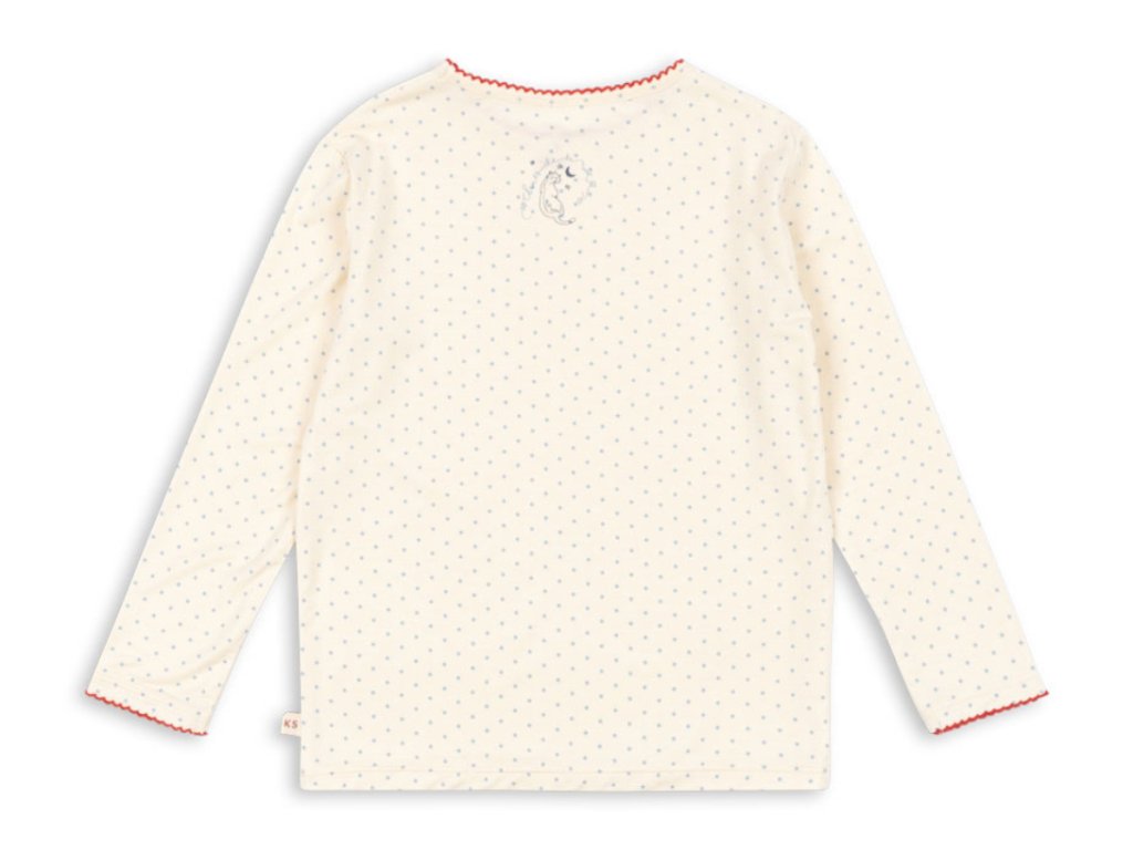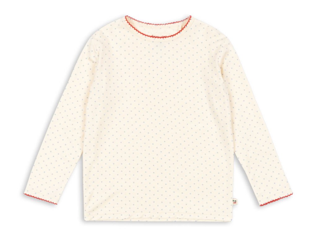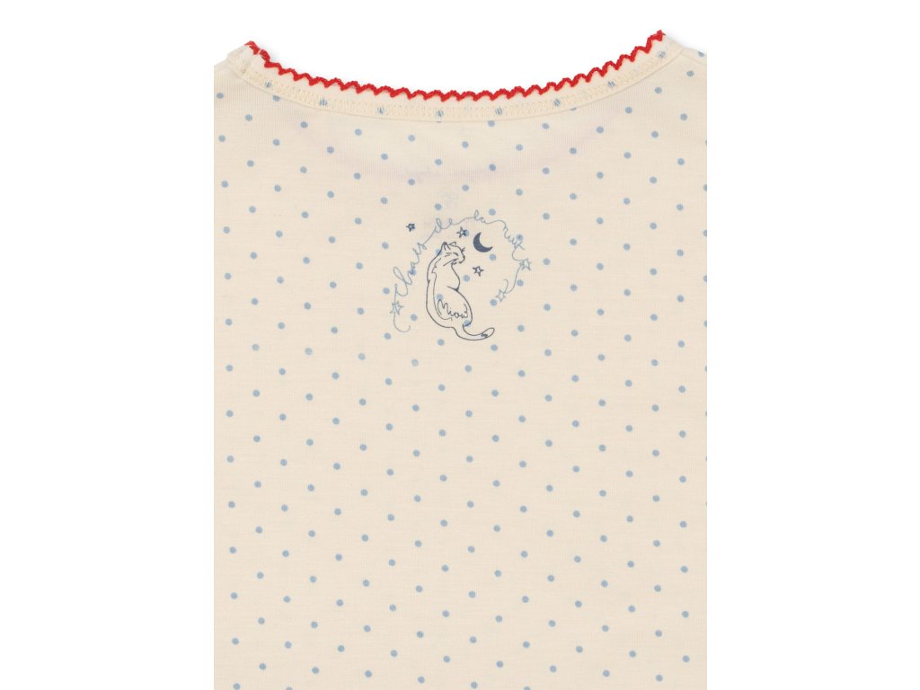 Modalové tričko od dánské značky Konges Sløjd si vaše holčičky zamilují. Tričko má dlouhý rukáv a modré puntíčky. Vzadu na krčku ho zdobí výšivka kočičky. Kolem výstřihu a rukávů je červený pikotový steh.