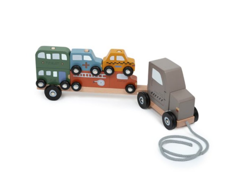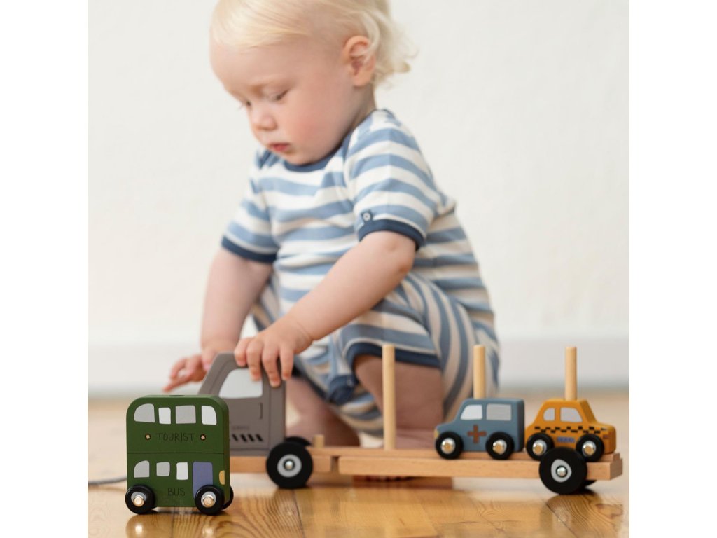 Krásný dřevěný přepravník slouží pro přepravu vozidel různých druhů. Děti na něm najdou hasičský vůz, vůz záchranné služby, taxi a dvoupatrový turistický autobus. Vozidla mohou děti skládat na sebe nebo si s nimi hrát samostatně. Přepravník má na začátku provázek, a tak je možné jej tahat za sebou. Nechte využít dětskou představivost a kreativitu.