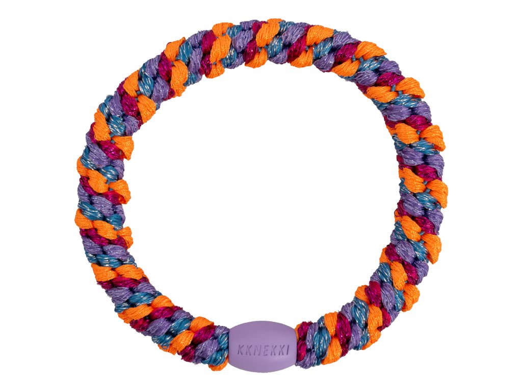 Pruhovaná gumička do vlasů od značky Bon Dep v jedinečné kombinaci barev – oranžová, modrá, fialová a růžová.