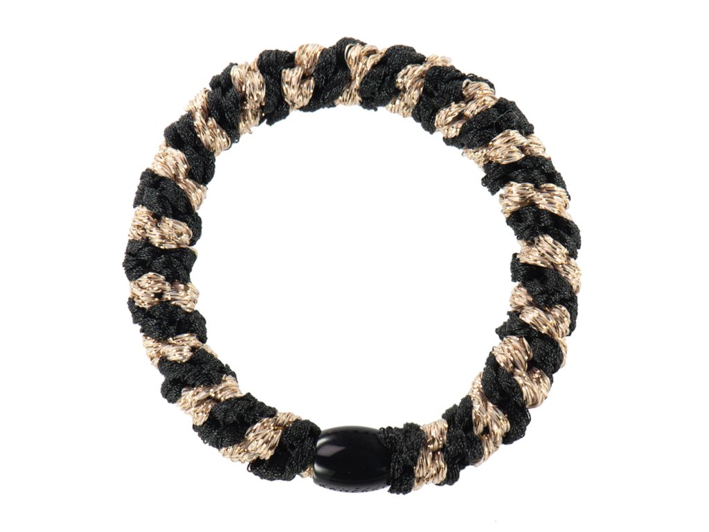 Pruhovaná černo-béžová gumička se zlatými třpytkami do vlasů od značky Bon Dep.