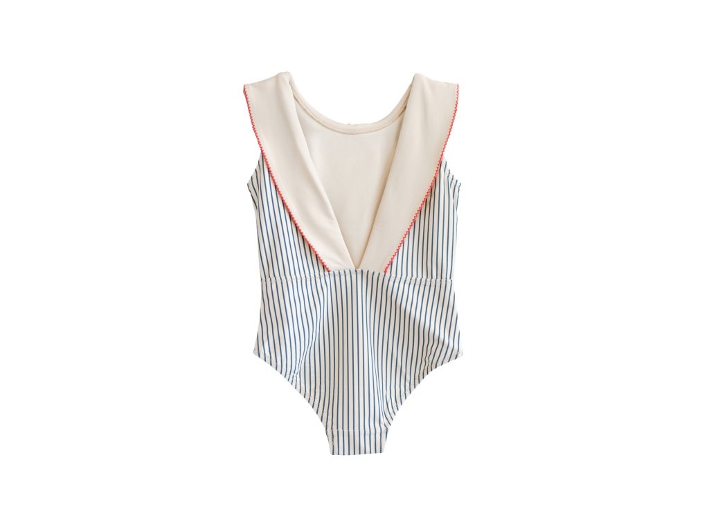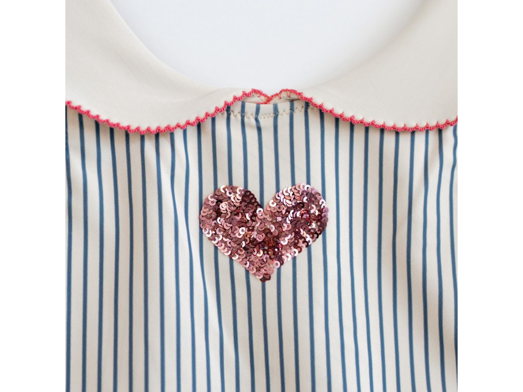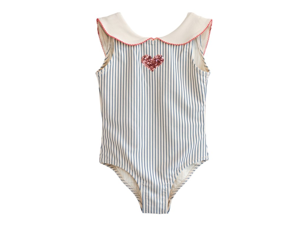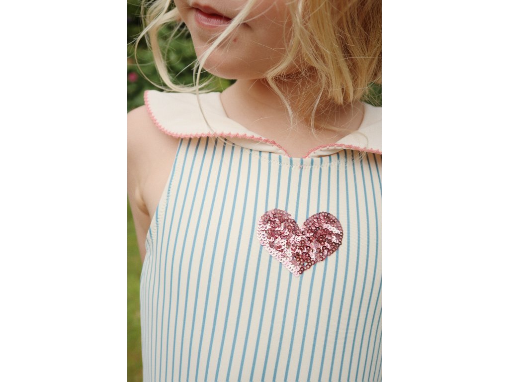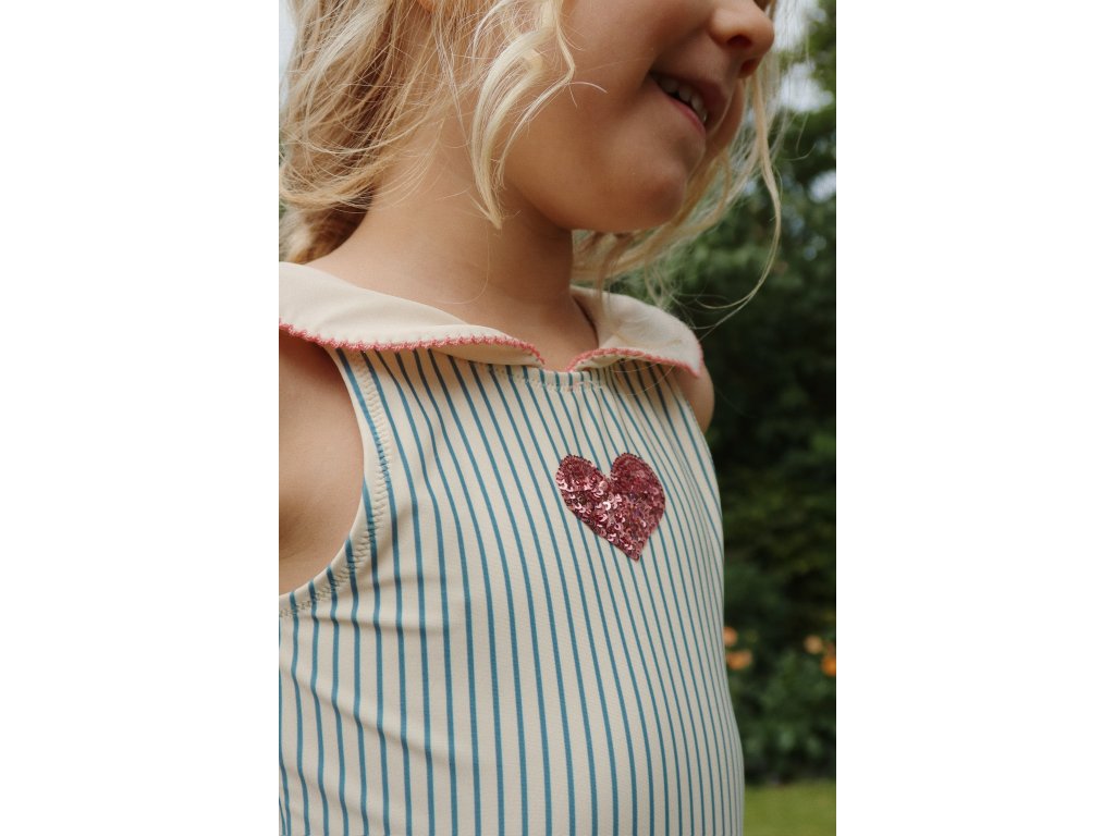 Jednodílné plavky od značky Konges Sløjd pro malé i větší slečny. Plavky mají nadčasový design proužků, které doplňuje elegantní límeček v přední části a roztomilé flitrované srdíčko.
