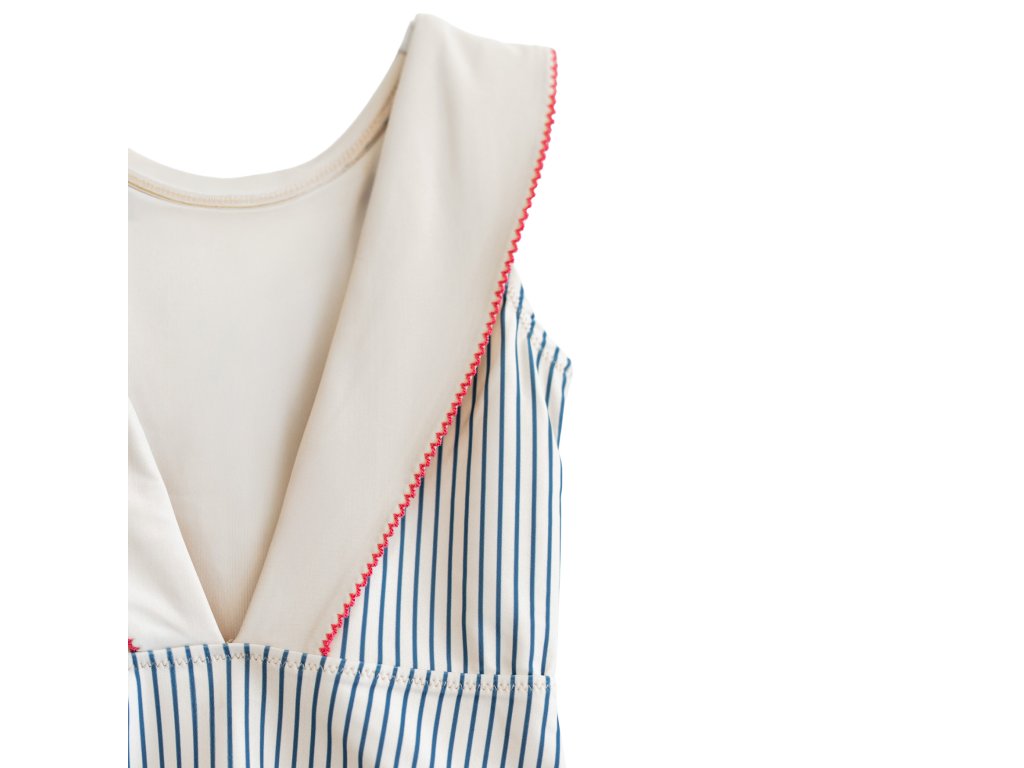 Jednodílné plavky Gina od Konges Sløjd okouzlí každou malou mořskou vílu! Jejich nadčasový design s modrými proužky a elegantním límečkem v přední části doplňuje roztomilé flitrované srdíčko na hrudi – protože i na pláži je důležité mít styl. Plavky jsou ušité z kvalitního a pohodlného materiálu, který je připraven na každé letní dobrodružství – ať už je to skákání do vlny, potápění v bazénu nebo stavění písečné pevnosti.