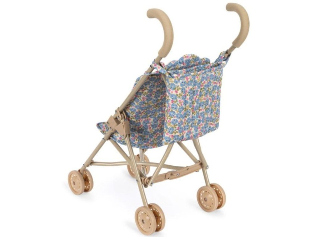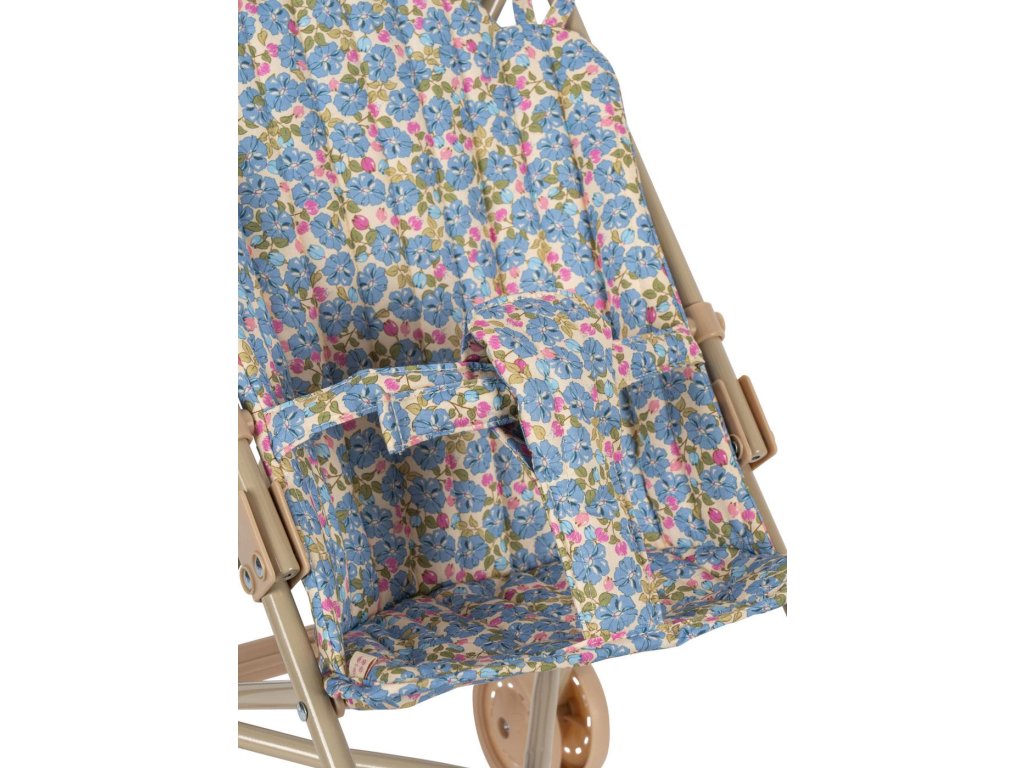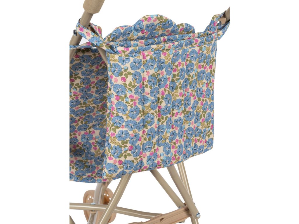 Sportovní kočárek pro panenky s popruhy, taškou na rukojetích a zdvojenými kolečky pro extra stabilitu. Zdobí jej nádherný vzor drobných květinek.