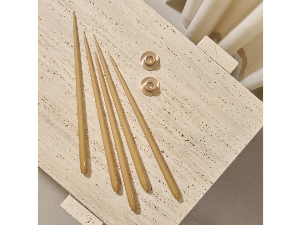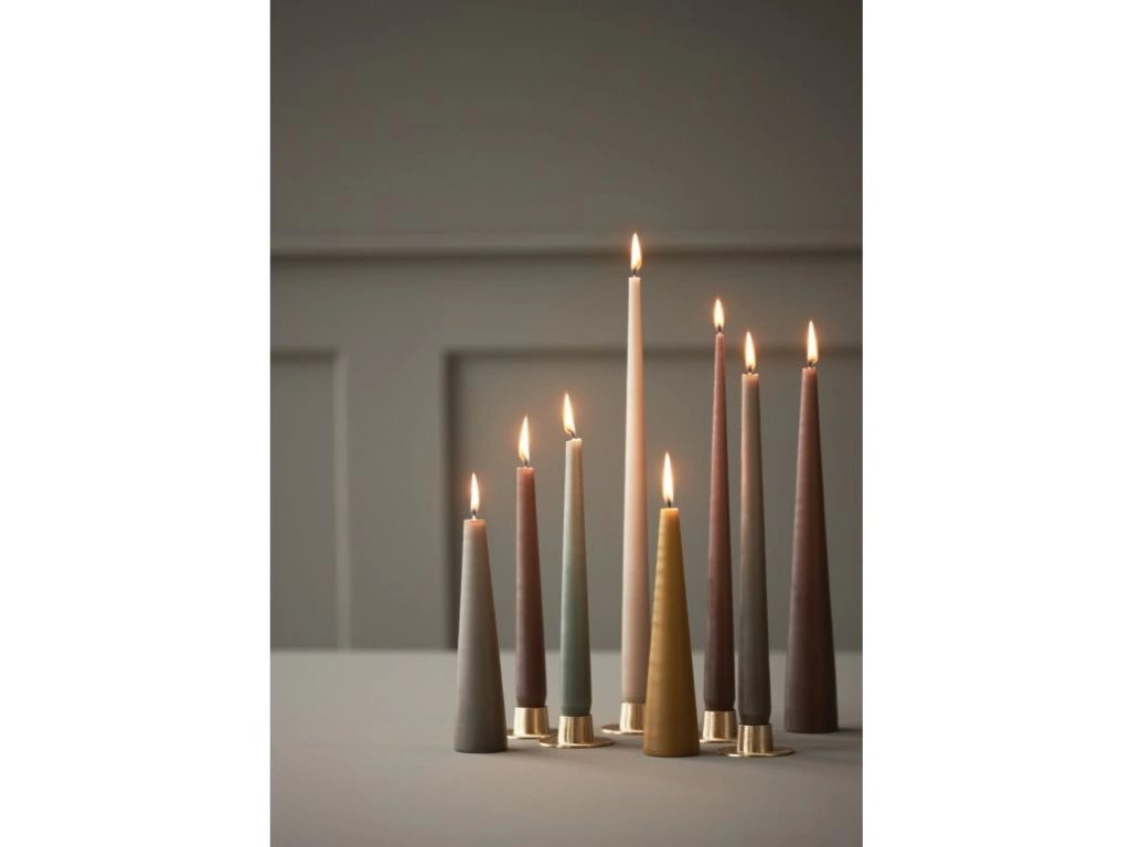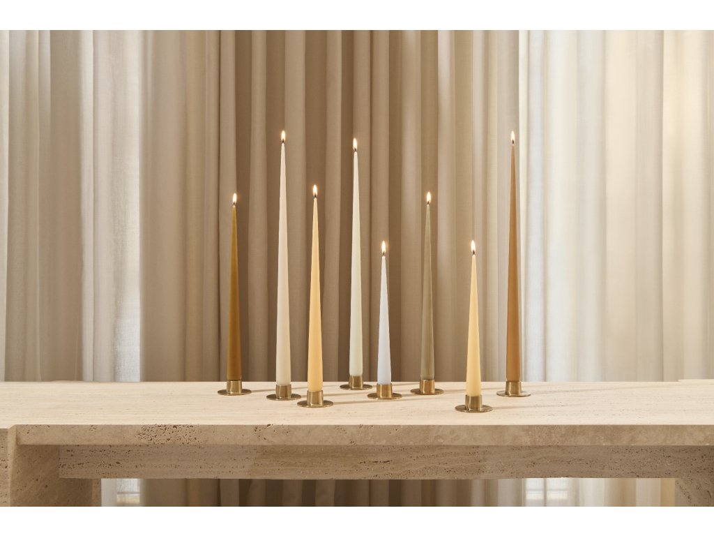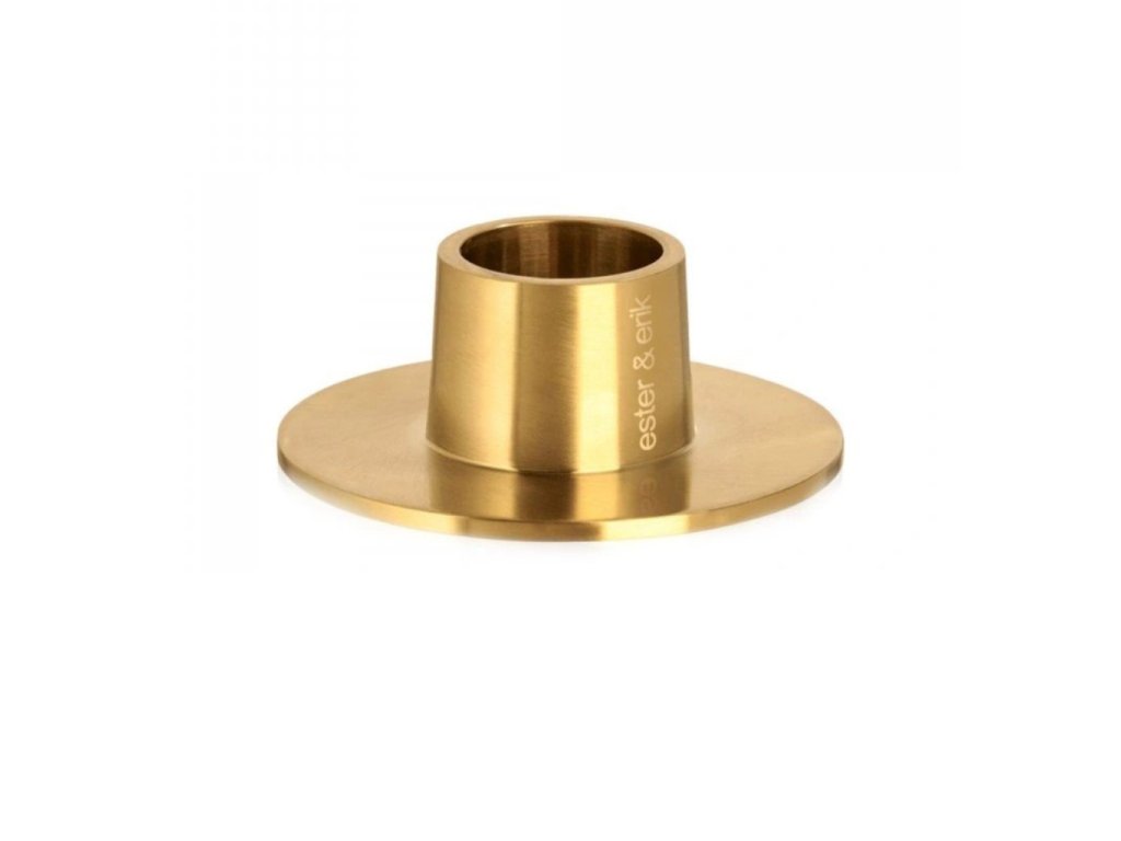 Kulatý svícen dánské značky Ester & Erik podtrhne krásu a eleganci vysokých svíček. Je vyrobený z nerezové oceli s exkluzivní PVD povrchovou úpravou, která patří k nejnovějším ekologickým metodám potahování kovů, poskytuje vynikající kvalitu a zvyšuje odolnost produktu. Zlatá barva s matným finišem sluší zejména všem teplým a pastelovým odstínům svíček.