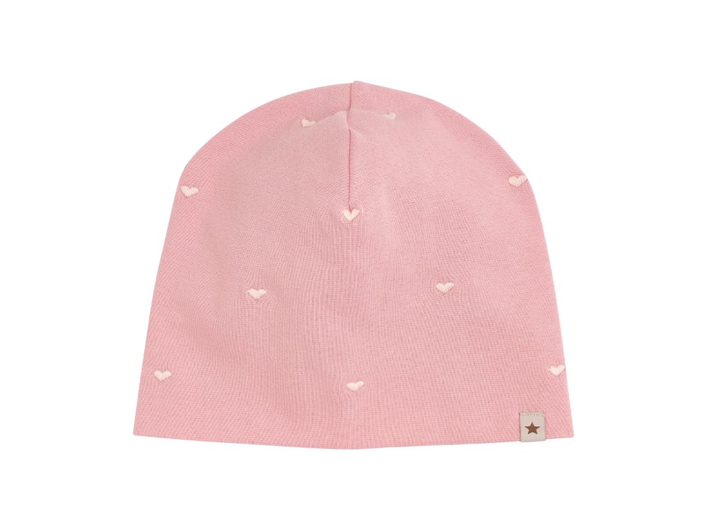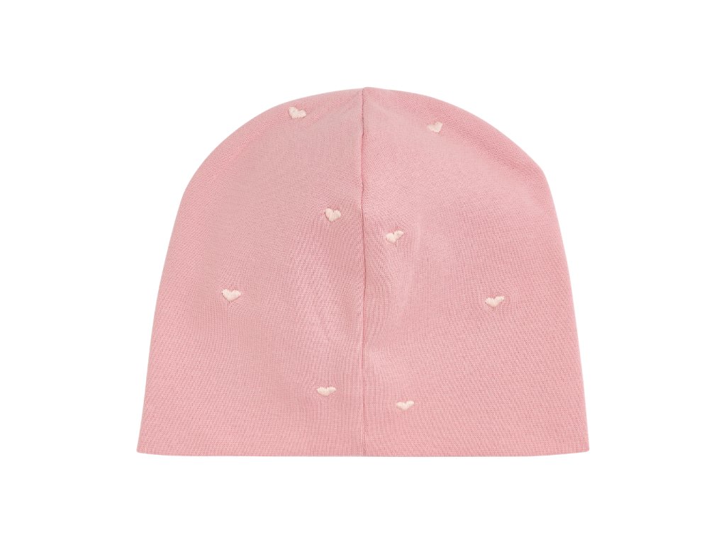 Lehká dětská čepička v růžové barvě se srdíčky je ideální pro přechodná období.