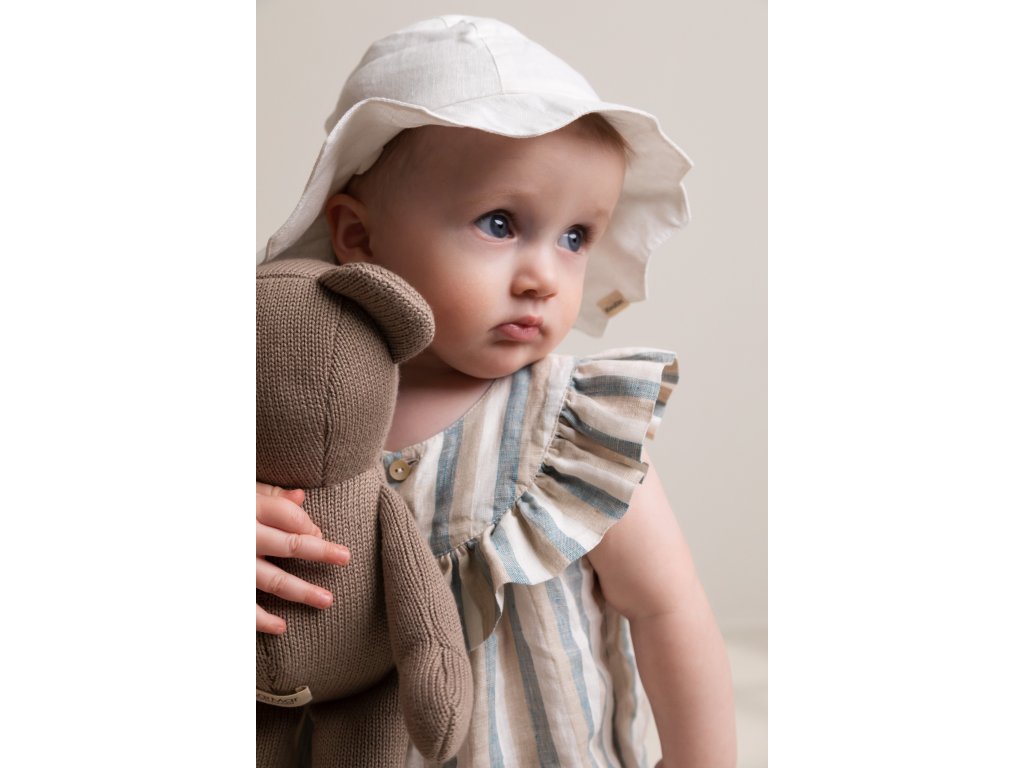 Ten nejdokonalejší a nejlehčí klobouček na léto od dánské značky MarMar Copenhagen. Je vyrobený ze 100% lnu. Vaše nejmenší ochrání před slunečními paprsky a postará se o to, aby se pod ním nepotila hlavička. Má elegantní volánkovou krempu a delší zadní část, která chrání před sluníčkem krk. Krásně sedí díky pružné gumičce a nechybí mu ani praktické šňůrky se zapínáním pod bradou.