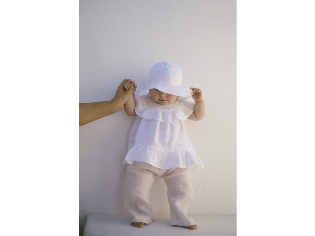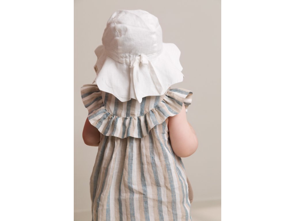 Dětský lněný klobouček v bílé barvě s volánkovou krempou a pružnou gumičkou. Nechybí mu ani praktické šňůrky, které se zapínají pod bradou ve třech možných úrovních.