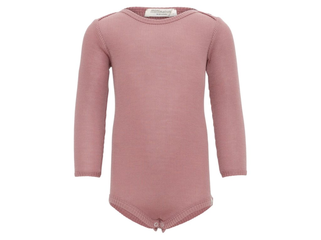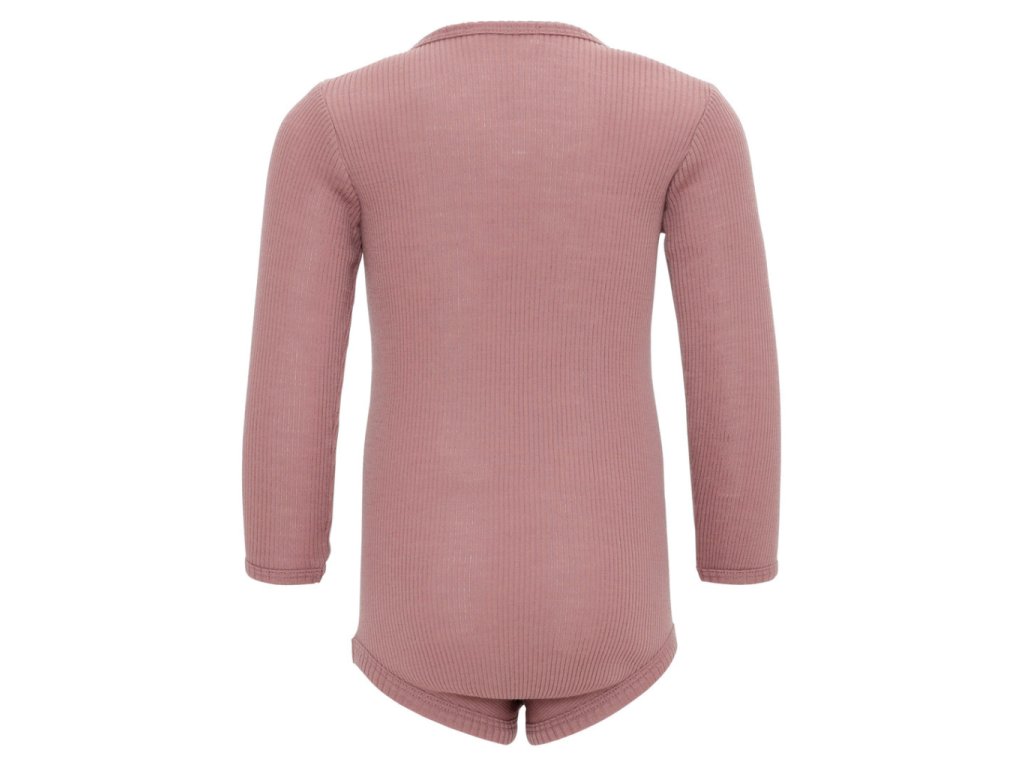 Růžové žebrované body s dlouhým rukávem a patentkami v rozkroku pro snadné přebalování. Body má jednoduchý nadčasový design, je lehoučké, jemné na dotyk a díky kvalitnímu zpracování merino vlny dokonale prodyšné.