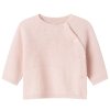Pohodlný pletený svetřík ve světle růžové barvě pro miminka. Svetr má raglánové rukávy, na levé straně zapínání na knoflíčky a je vyrobený z měkoučké merino vlny.