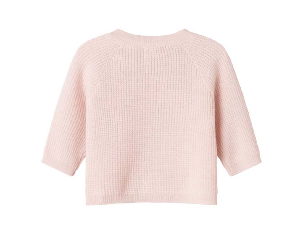 Pohodlný pletený svetřík ve světle růžové barvě pro miminka. Svetr má raglánové rukávy, na levé straně zapínání na knoflíčky a je vyrobený z měkoučké merino vlny.