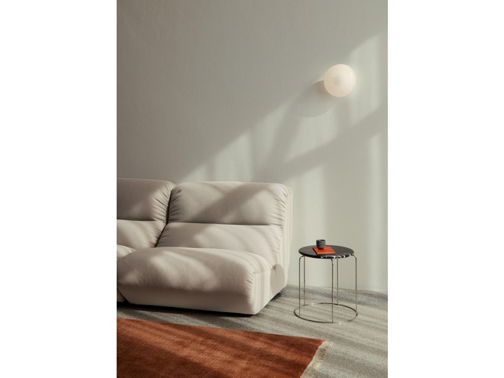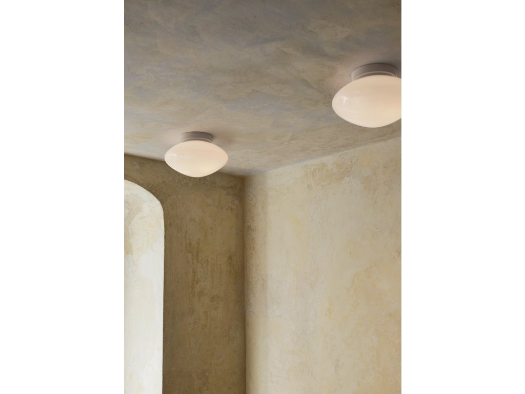 Lampa je vyrobená z ručně foukaného opálového skla s decentními bílými detaily z hliníku. Dodává se bez žárovky.