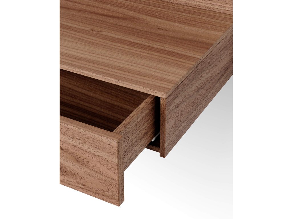 Vyrobený z ořechové dýhy s krásně přirozenou texturou, stolek přináší do vašeho domova teplo a jemný dotek přírody. Jeho úložný prostor je chytře navržen tak, aby uschoval vše potřebné – od knih přes brýle až po další drobnosti, které chcete mít při ruce, a zároveň udržel prostor uspořádaný a vizuálně čistý.