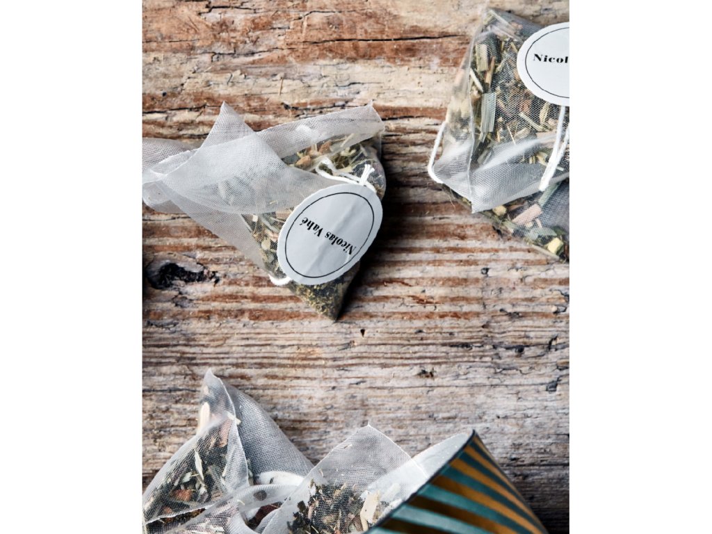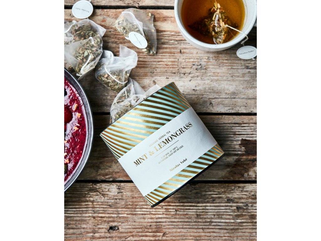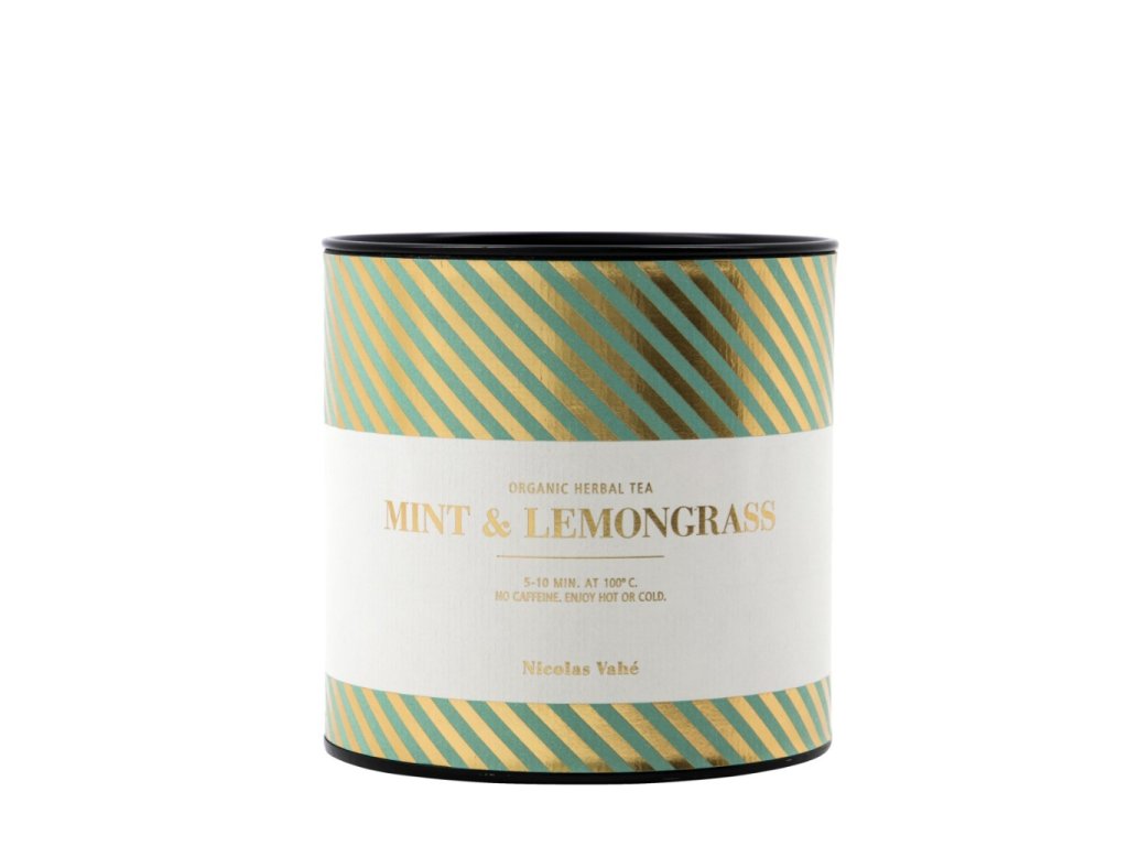 V elegantní dóze se skrývá 20 sáčků se směsí povzbuzující citronové trávy a máty peprné, kterou harmonicky doplňují kousky jablek, kořen lékořice, květy heřmánku, listy jahodníku, fenyklu, lipových květů a květy měsíčku.