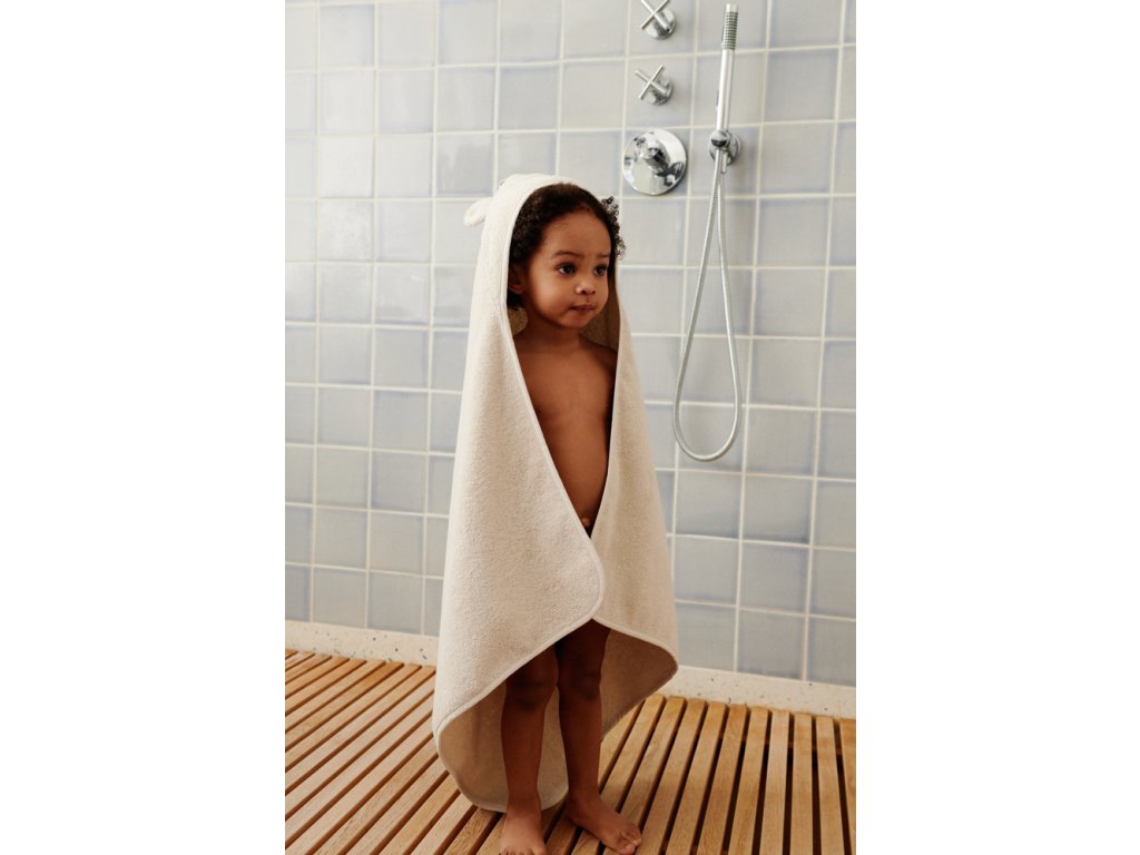 Čtvercová osuška z organické bavlny s certifikací GOTS v krémové barvě pro menší děti. V rohu osušky je kapuce ve tvaru ledního medvídka.