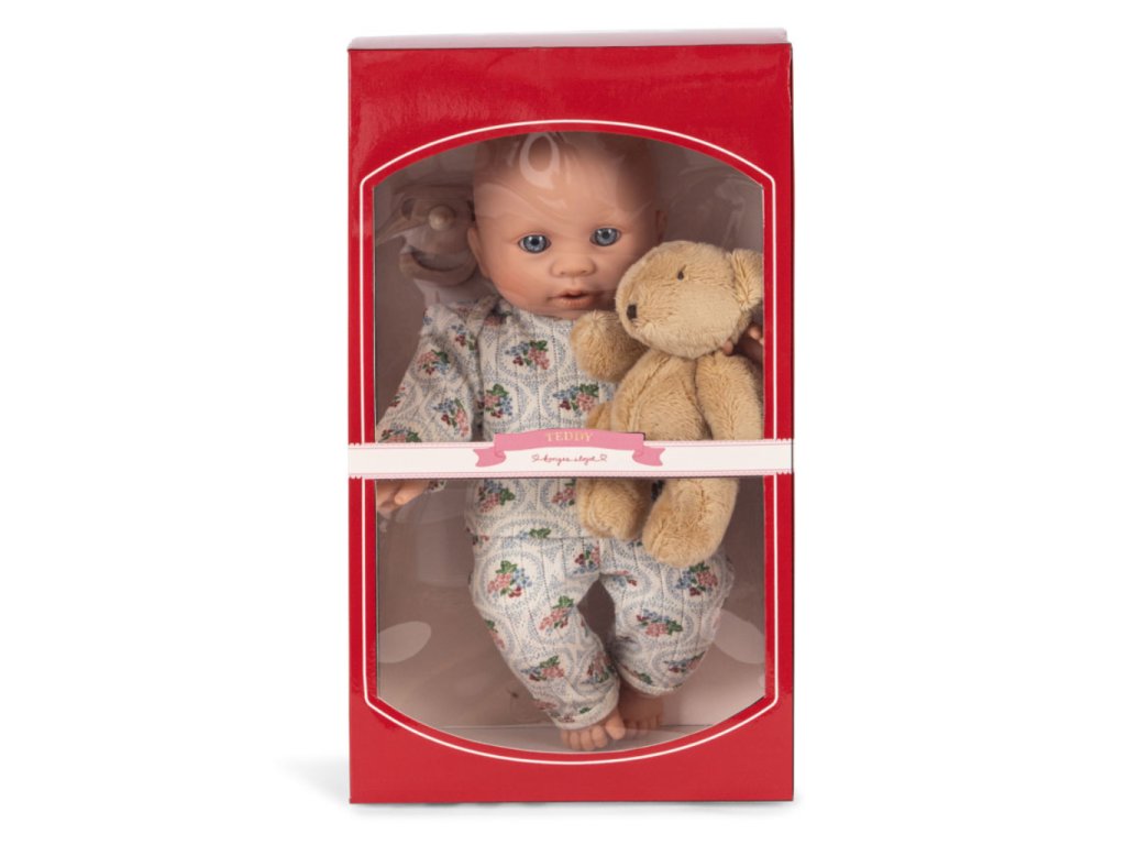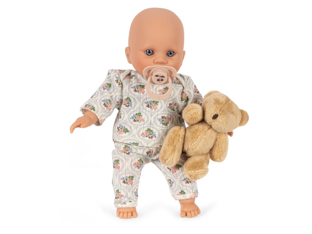 Panenka pro děti vyrobená z vinylu a organické bavlny, s výplní z recyklovaného polyesteru. Panenka má na sobě dvoudílné pyžámko, které je vyrobené ze 100% organické bavlny a děti jej zvládnou panence snadno oblékat a svlékat. Panenka má velmi reálně vypadající oči a dudlík. Nechybí jí roztomilý plyšový kamarád v podově medvídka.