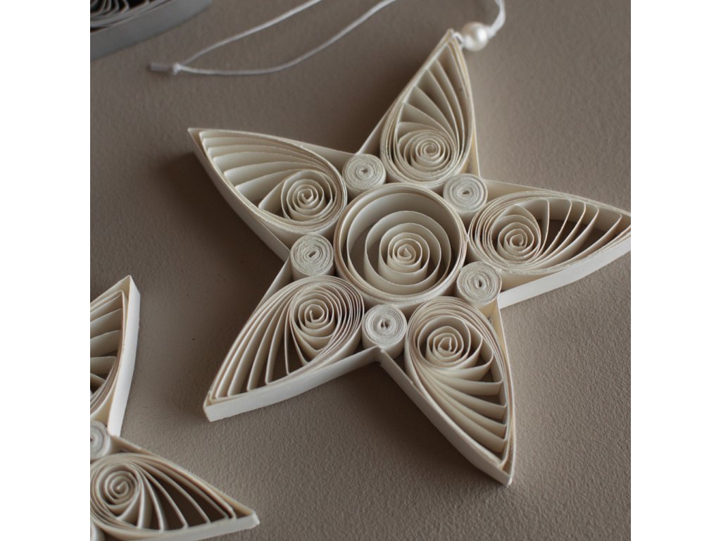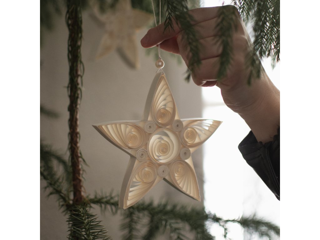 Papírová vánoční ozdoba ve tvaru hvězdičky vnese do vaší sváteční atmosféry dotek magie. Ozdobu lze pomocí šňůrky zavěsit na vánoční stromeček, na jehličnaté větvičky ve váze, anebo ji naaranžovat na věnce či zdobné girlandy.