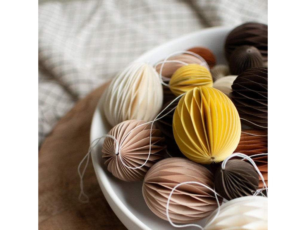 Elegantní papírová ozdoba ve tvaru vajíčka vytvoří u vás doma kouzelnou jarní atmosféru. Díky šňůrce ji můžete snadno zavěsit na velikonoční věnce, větvičky zlatého deště nebo přímo do oken. Krásně také vypadá jako součást květinového aranžmá.