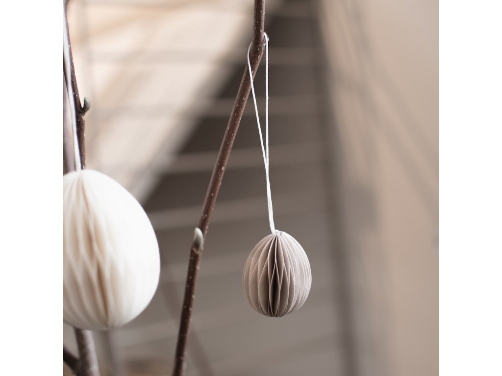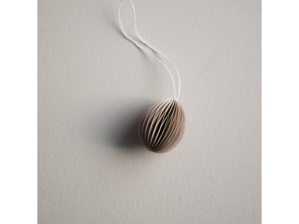 Papírová velikonoční ozdoba ve tvaru vajíčka v elegantní pískové barvě. Ozdoba je vybavena praktickou šňůrkou, díky které ji můžete snadno zavěsit do oken, na větvičky nebo jarní věnce.