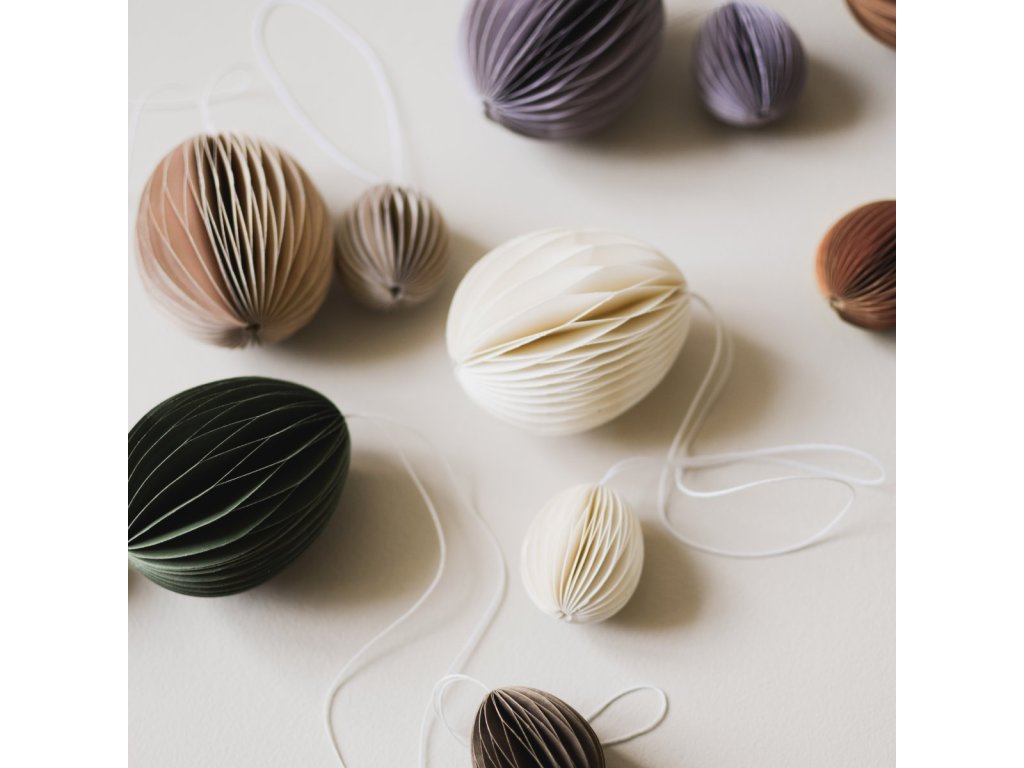 Elegantní papírová ozdoba ve tvaru vajíčka vytvoří u vás doma kouzelnou jarní atmosféru. Díky šňůrce ji můžete snadno zavěsit na velikonoční věnce, větvičky zlatého deště nebo přímo do oken. Krásně také vypadá jako součást květinového aranžmá.