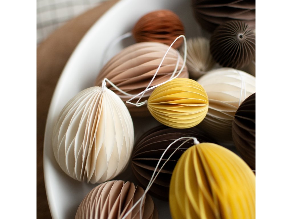 Elegantní papírová ozdoba ve tvaru vajíčka vytvoří u vás doma kouzelnou jarní atmosféru. Díky šňůrce ji můžete snadno zavěsit na velikonoční věnce, větvičky zlatého deště nebo přímo do oken. Krásně také vypadá jako součást květinového aranžmá.