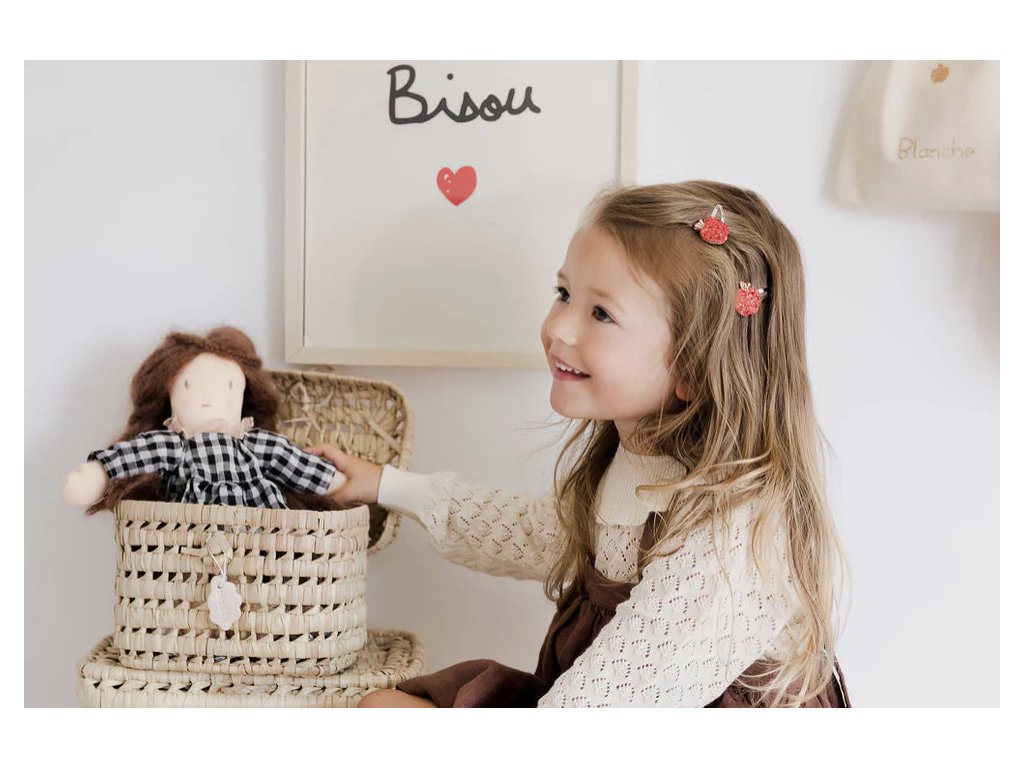 Pár třpytivých sponek s jablíčky od francouzské značky Luciole et Petit Pois je nádherným doplňkem pro úpravu všech typů dětských vlásků.