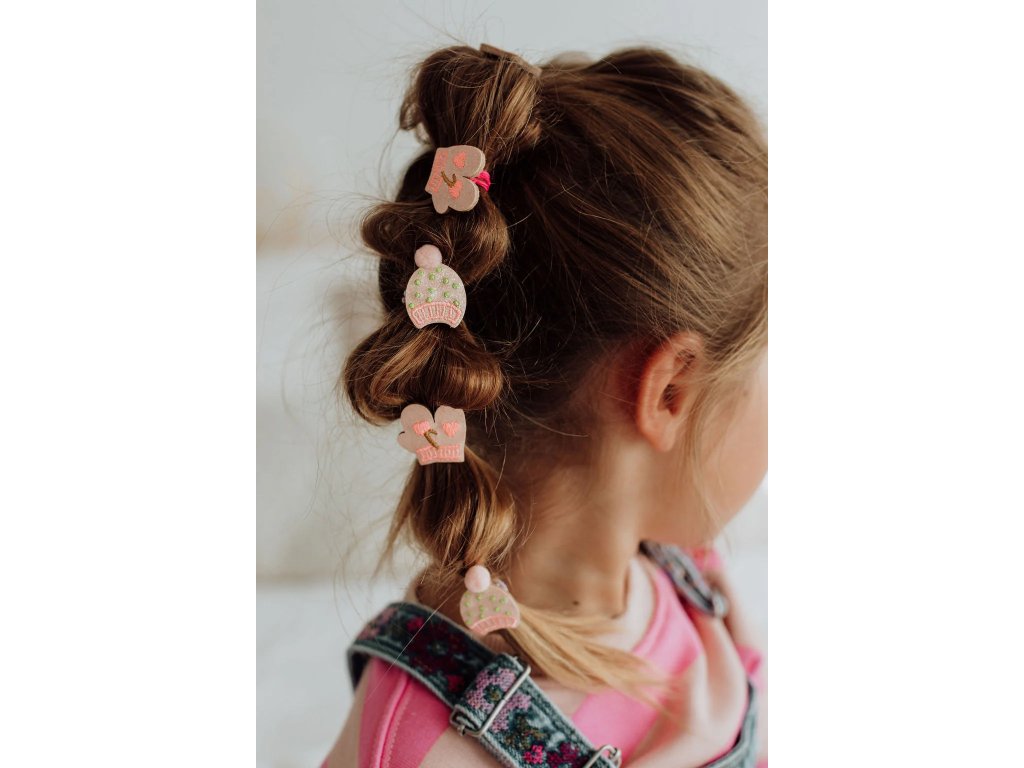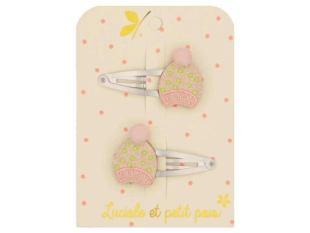 Pár třpytivých sponek se zimními čepicemi od francouzské značky Luciole et Petit Pois je nádherným doplňkem pro úpravu všech typů dětských vlásků.